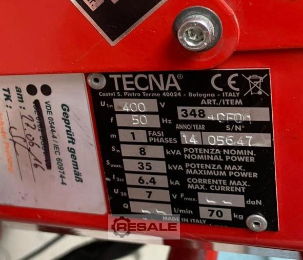 MF welding machine with water-cooled impact pointMedium frequency impact pointManufacturer: TECNA (Italy) Type 3670 E CF00Serial No.: 00022 Year of construction 2014Nominal welding capacity 25 kVAMax. Welding power 160 kVANnet connection 400 volts, 50 Hz- Welding control TE750 or TE760- Impact point for one-sided spot welded joints- Ideal for repair work in the body area with the best welding quality- Water-cooled type 2BHPLN- Mobile transport trolleyWeight approx. 155 kgvery good condition - As good as new;