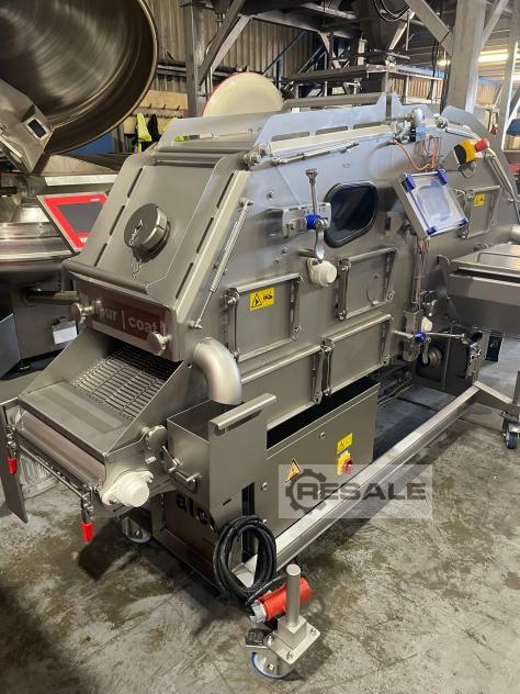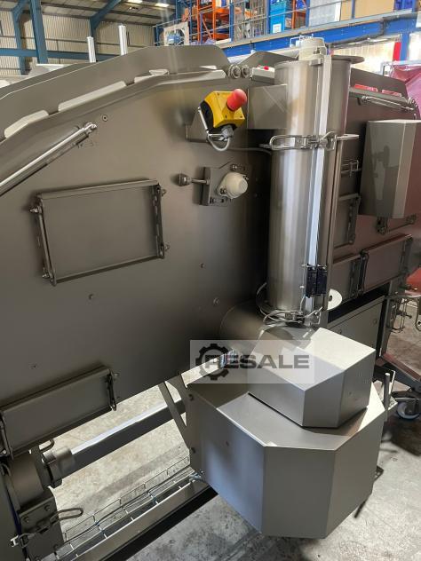 Plant for shredding of frozen blocks consisting of:, Coarse pre-cutting - Blocks are fed directly from the pallet into the machine with a forklift, the pre-cut pieces are taken over by a Z-band and transported to Vogelsang - shredding. They are inspected for metal contamination by a LOMA metal detector., The shredded parts are conveyed via a Z- conveyor belt to the batching plant. It has a capacity of approx. 2,000 kg. The batching container rests on load cells. A pallet box conveyor system ensures that the pallet boxes are filled with a preset weight and transported further after filling., Further data, photos, and videos available on request., The machines can also be purchased individually.
