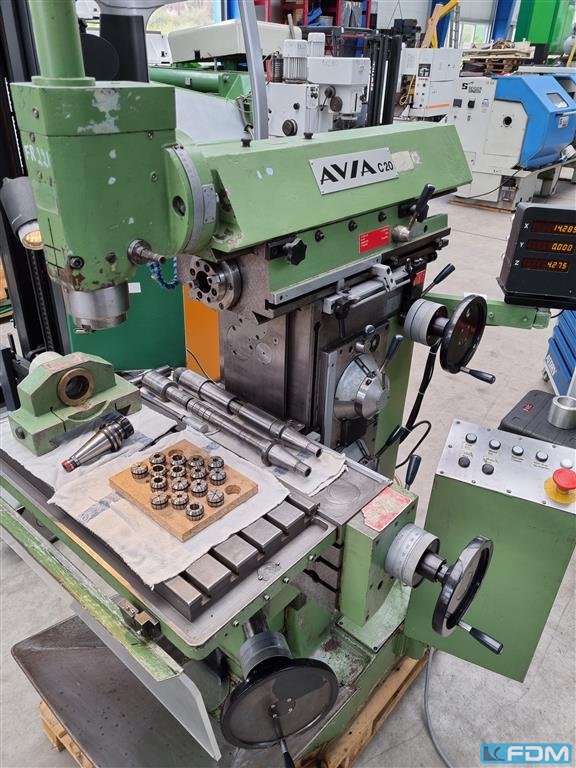 Fraiseuse - Universelle Faire: AVIA Type: FND 25 Année de construction : 1984 Type de contrôle : conventionnel Pays d’origine : Pologne Délai de livraison : Tout de suite Détails techniques X-Way : 400 millimètres Voie Y : 360 millimètre Voie z : 400 millimètres Table de montage : 800 x 400 millimètre Porte-outil : SK40 Moyeu Quill : 100 millimètre Vitesse: 40...2000 tr/min Puissance totale requise : 4,5 kW Poids de la machine env. : env. 2,4 t Encombrement approximatif : L : 1,6 x l : 1,3 x H : 2,0 m
