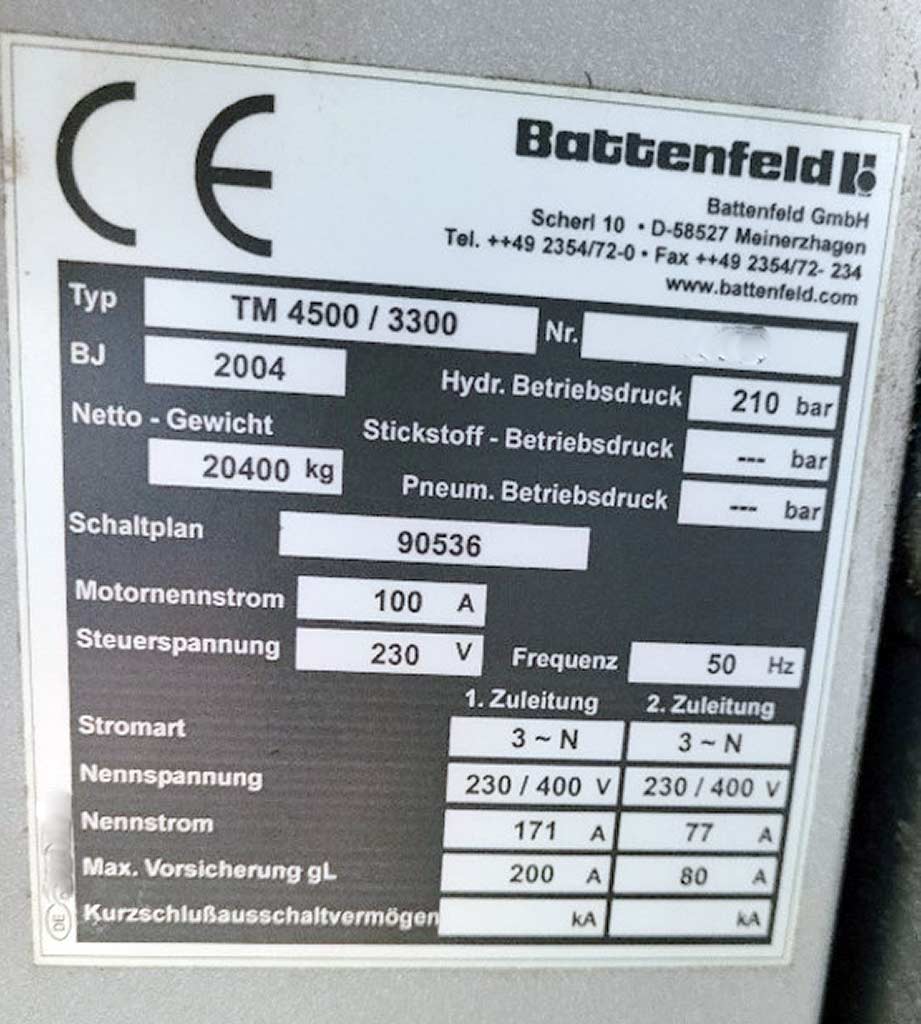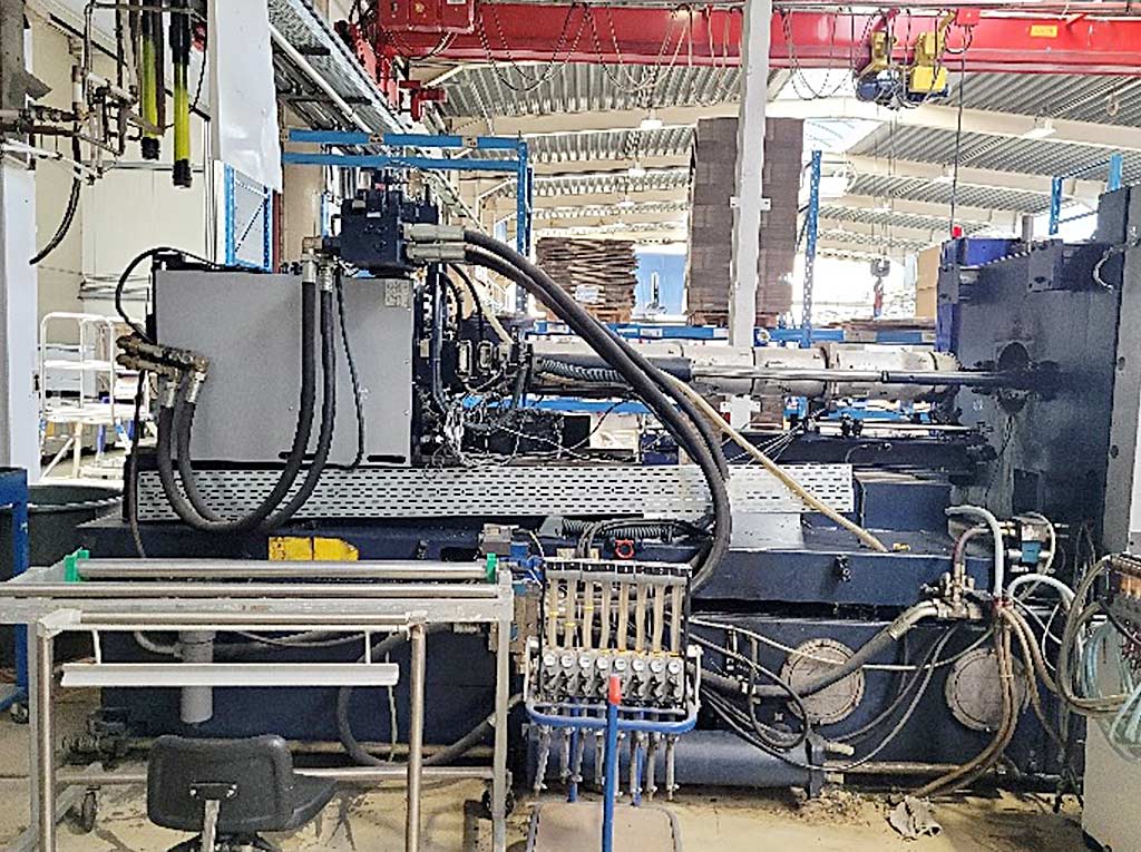 Dostępna jest duża pozioma maszyna do formowania wtryskowego Battenfeld. Ciśnienie robocze: 210bar, siła zaciskowa: 4500kN, średnica śruby: 85mm, objętość wtrysku: 2128cm³, ciśnienie wtryskowe: 1624bar, rozstaw drążków: 900mm/800mm, skok otwierania: 950mm, maksymalna wysokość montażu formy: 970mm, objętość oleju: 900l, obciążenie podłączone: 55kW, masa: ok. 20400kg. Dokumentacja dostępna. Możliwe jest przeprowadzenie inspekcji na miejscu. Maszyna ma wadę.