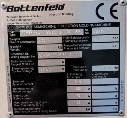 Wittmann Battenfeld SmartPower 50/100 UNILOG B6 Rok: 2015 Waga: 3000 kg Schemat połączeń nr. SP-SHB6P136180-100 Napięcie sterujące: 24 DC V Rodzaj prądu: 3N Napięcie znamionowe: 400 V Prąd znamionowy: 70 A Maksymalna wartość bezpiecznika: 80A Znamionowy prąd zwarciowy SCCR: 10 KA