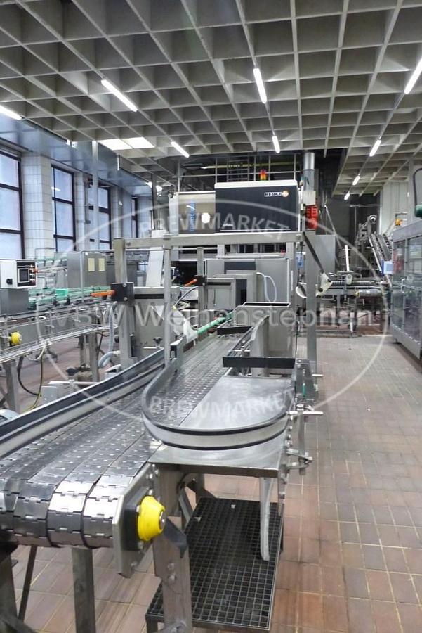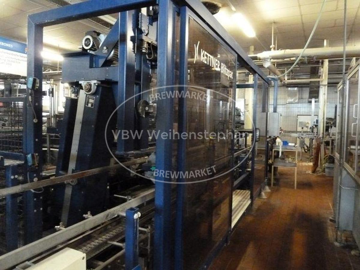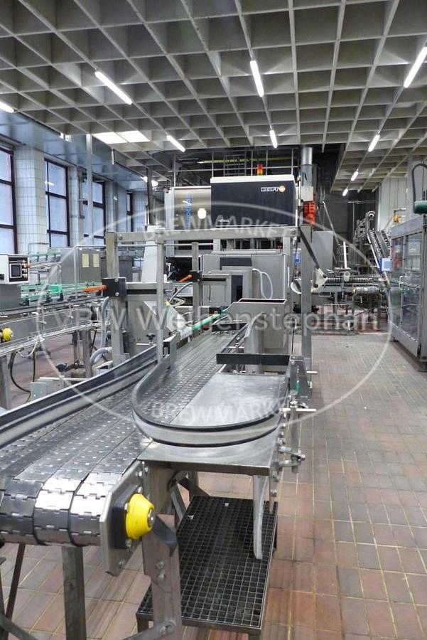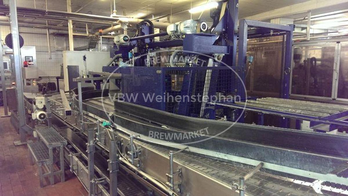 Depalletising and palletising system for Euro pallets with PETCYCLE crates. The empties pallets arrive via a lift from above. They first pass through a pallet denester, in which the empties are fixed, the transport securing cord is cut off and vacuumed. The crates are then destacked and transferred to the bottle ejector. The pallets continue to the pallet magazine/loader. After the pallets have been reloaded, they are secured with a cord and transported upwards in the second lift. Our team at VBW Asset Trade will be happy to answer your questions. Send us an inquiry or simply give us a call!, Additional title: Depalletising and palletising, Unloading capacity: 3600 crates/h, Loading capacity: 3600 crates/h, Power: 21 kW, Voltage: 230/400 V, Frequency: 50 Hz, Compressed air: 6 bar, 30 Nm³/h, Formats: Euro pallet, PETCYCLE crates, 20 x 0.5 l (400 x 300 x 256 mm), 9 x 1.0 l, 6 x 1.0 l, 6 x ...
