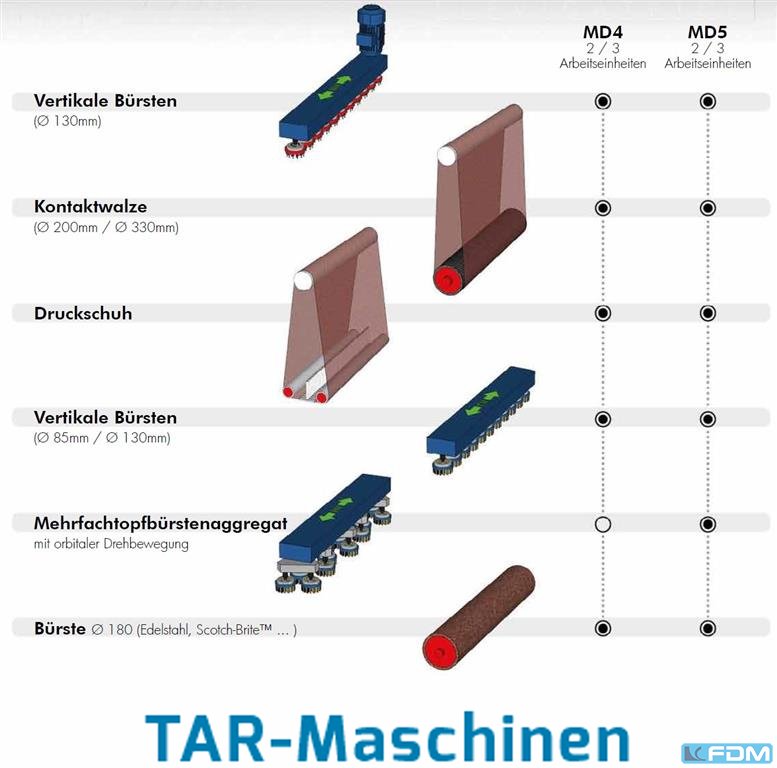 Deburring and fine grinding machine for sheet metal / flat material, new The compact machining centre for deburring, slag removal, rust removal, oxide layer removal, edge rounding, fine grinding through to polishing metal surfaces. Working height: variable from 0,5mm ? 150mm adjustable Working width: 1150 mm Maximum part weight: 300 kg Wide belts with abrasive belt unwinding: 2200 mm As standard with vacuum hold system, optional with magnetic hold system Due to the modular design of the machines, it is possible to offer the optimal configuration for the customer's machining task. The machine structure can accommodate up to 3 internal machining units and an additional external machining unit. Please, contact us for getting more information and pictures on mail(at)tar-mc.com or www.tar-mc.com