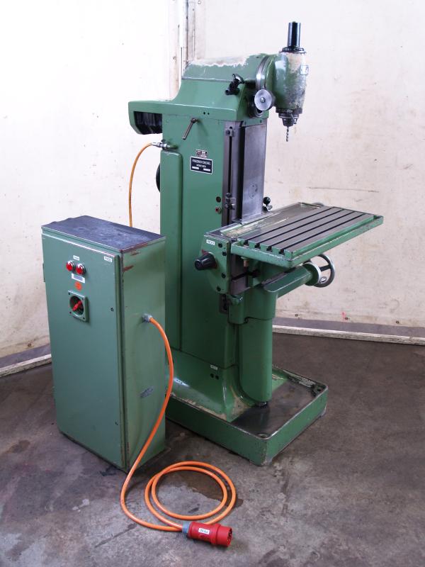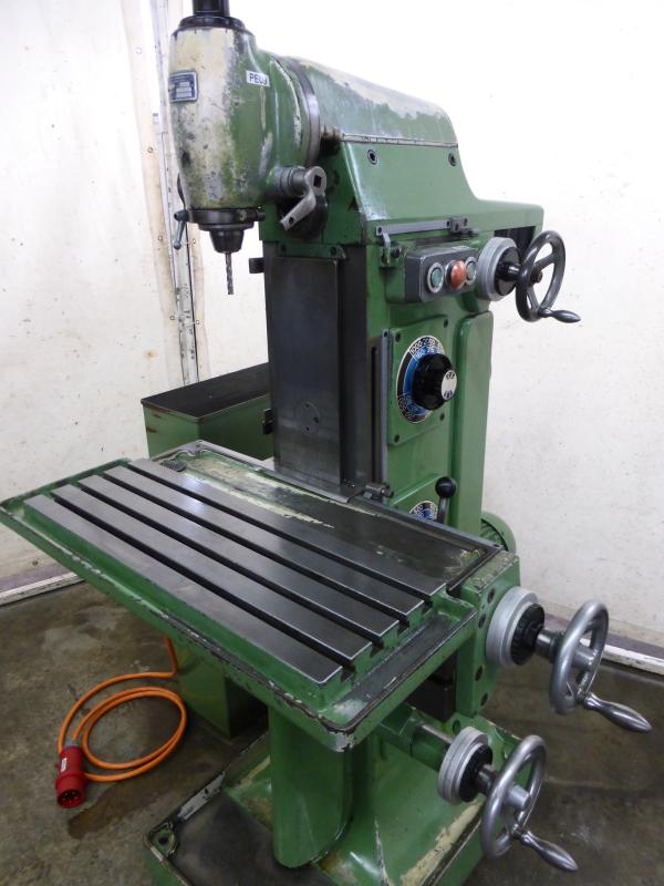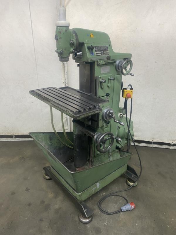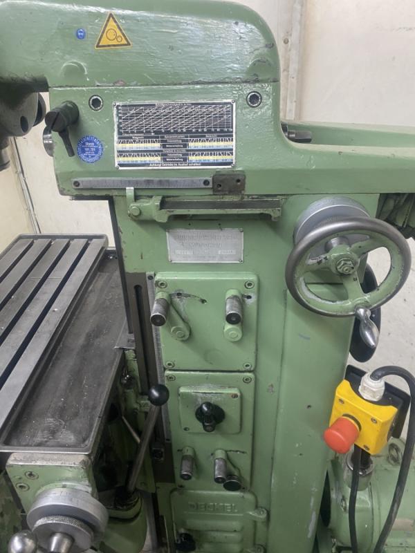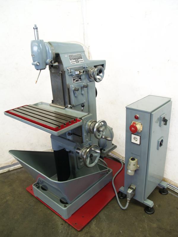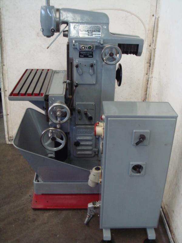 Fresadora de herramientas univ. DECKEL Tipo FP 1Masch. Nº 33064 Año de construcción aprox. 1960 Revisado en 2012Distancias de recorrido X: 300 mm Y: 150 mm Z: 330 mmTamaño de la mesa 600 x 210 mmSoporte de husillo MK 4 - S20 x 2Velocidad del husillo vertical 95-1900 rpm. 12 pasosVelocidad del husillo horizontal 60-1200 rpm. 12 pasosPotencia del motor 1,1 y 1,4 kWNª conexión de erg 380 voltios, 50 Hz- Avance en los ejes X e Y- Desplazamiento del piñón en el cabezal de fresado vertical- Mesa de ángulo fijo- Dispositivo de refrigeración con bomba mecánica en el pie de la máquina-