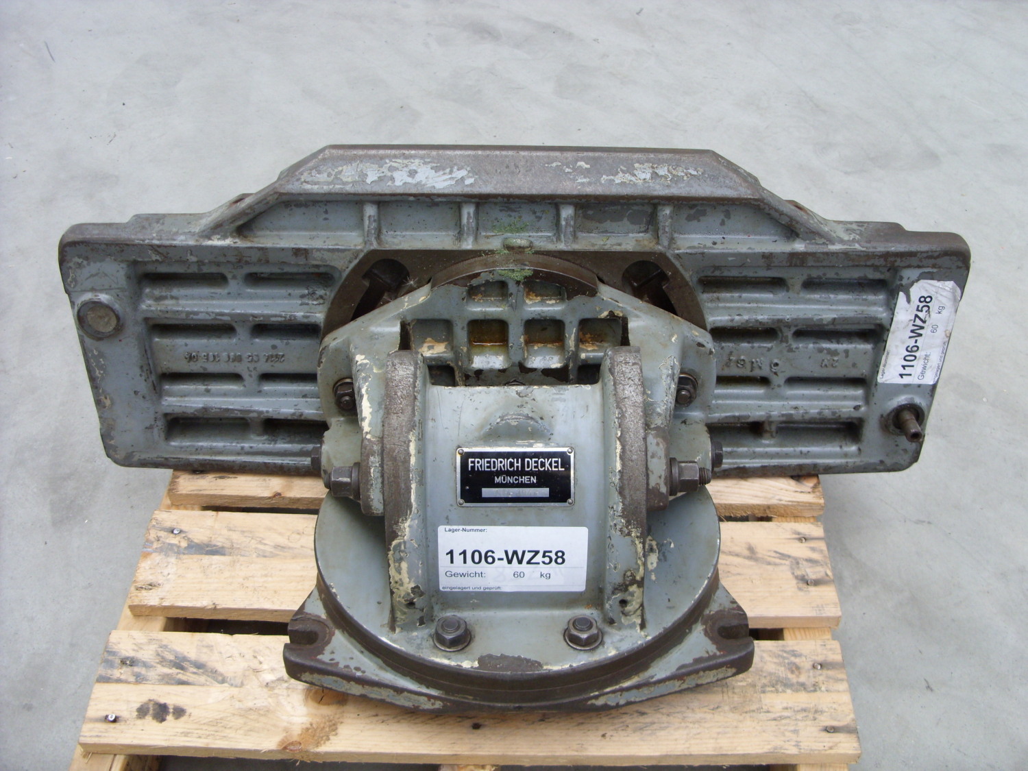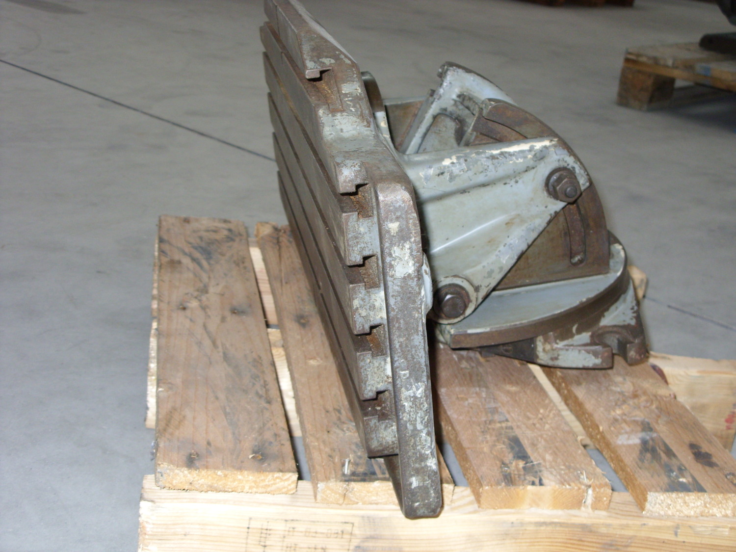 Mesa giratoria, oscilobatiente y giratoria DECKELL Mesa de fijación de fresadoras de herramientas universales adecuada para FP 2L o FP 3L o FP 4LNr. 2314-0301 Año de construcción: aprox. 1975Superficie de sujeción: 1000 x 520 mm- 6 ranuras de sujeción 16 mm, distancia 90 mm- La placa de sujeción se puede girar horizontalmente hacia la derecha y hacia la izquierda hasta 45 grados- Inclinable desde/hacia la máquina +/- 15 grados- Giratorio +/- 15 grados- Mesa giratoria, mesa basculante, mesa angularCarga permitida máx. 1000kgPeso: 400kgbuen estado; usado