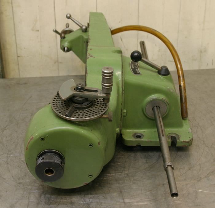 Spiral milling attachment, dividing head, dividing head, rotary table, rotary table dividing head, spiral milling attachment with all accessories -comes from a lid FP2 -Dividing head: Spiral milling attachment with all accessories, change gears, dividing plates -Maximum width: 415 mm -Recording: SK40 - Suitable for: Milling cutter sharpening -Translation: 1:40 -Dividing head: swiveling -Dimensions: 820/390/H440 mm -Weight: 80 kg