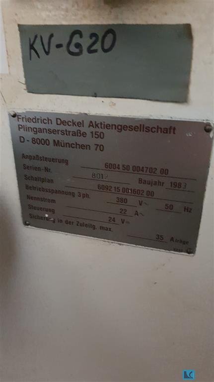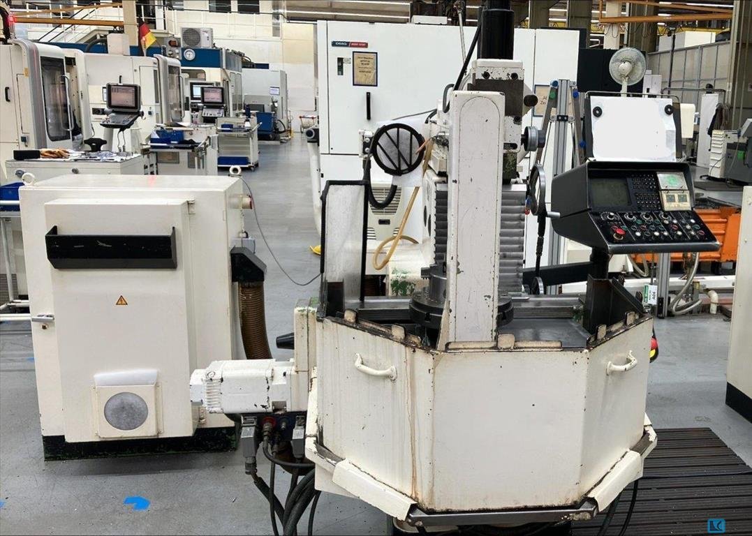 Deckel FP3A 2820 - Fresatrice CNC - Controllo CNC Deckel Contour 3 - Testa di fresatura verticale mobile con mandrino estensibile - Controcuscinetti per mandrini di fresatura lunghi - Pinza idraulica per utensili - Cambio manuale automatico a velocità - Bloccaggio automatico negli assi X/Y/Z - Lubrificazione centralizzata automatica - Dispositivo refrigerante - Misurazione diretta dello spostamento - Frizione anticollisione sugli assi Z/Y - Costruito nel 1987 Indicazioni Workspace: - Asse X (longitudinale): 485 mm - Asse Y (trasversale): 385 mm - Asse Z (verticale): 380 mm - Corsa cannotto verticale: 80 mm Cpovd9Rv - La testa di fresatura verticale può essere spostata sul poggiatesta: 150 mm Trasmissione principale: - Motore: motore autofrenante trifase commutabile su poli e cambio manuale con rotazione oraria/antioraria - Potenza: 3,7 / 4,4 kW - 18 velocit ...