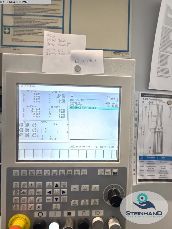 turning diameter: 220 mm Control: GE Fanuc 18i-TB x-travel: 400 mm z-travel: 450 mm tool taper: VDI 40 number of tool places: 12 Pos. spindle tunring speed: 6.000 U/min Number of working hours: 10741 h work stroke: 150 mm X-Achse EMAG VL5 vertical lathe, built in 2003, very good condition, ready for use, but currently not in operation. Accessories: Extraction system 9 tool holders, 4 of which are driven tools 1 pallet Various workpiece carriers The data for this ad was created with ModulMWS - the software solution of LogoTech oHG.