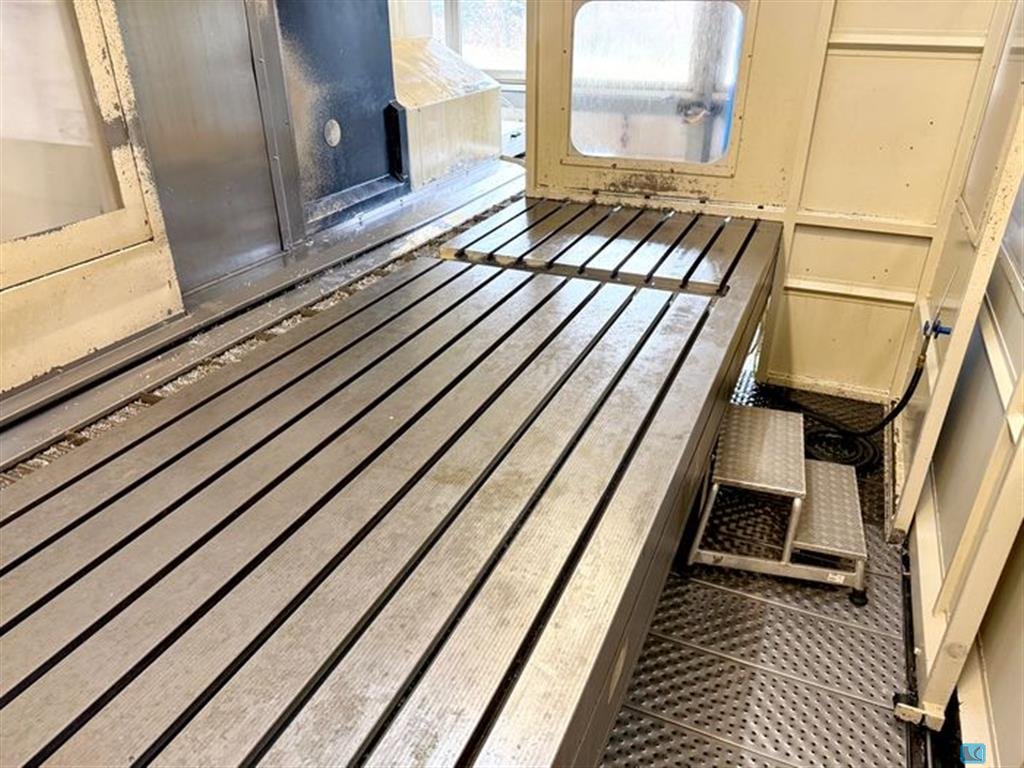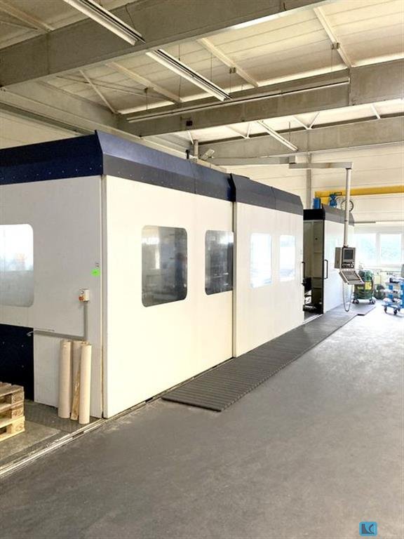 x-travel:8500 mm y-travel:2000 mm z-travel:1500 mm rapid travel x/y/z:25 m/min table-size:10.000 x 1.350 mm table load:max. 5 t/qm universal head:orthogonal 1° x 1° tool taper:SK 50 milling head speed:4.000 1/min power capacity:37 kW max. torque on the spindle:900 Nm internal coolant system feed:15 bar control:HEIDENHAIN iTNC 530 Tool changer:60 Pos. total power requirement:75 KW dimensions of the machine ca.:12,7 x 5,2 x 4,6 m weight of the machine ca.:35 t universal travelling column - universal machining center, orthogonal milling head, water-cooled, with 1° indexing in 2 axis (360 pos. in rear layer, 270 pos. in front layer) 3D touch probe M&H 20.41, dividing wall for 2 table machining, internal air blast, 15bar high pressure pump, prepared for HSC milling heads incl. torque support, moveable operator-cabin/panel, chipconveyor, handwheel HR 410, controlled security fence, miscella ...
