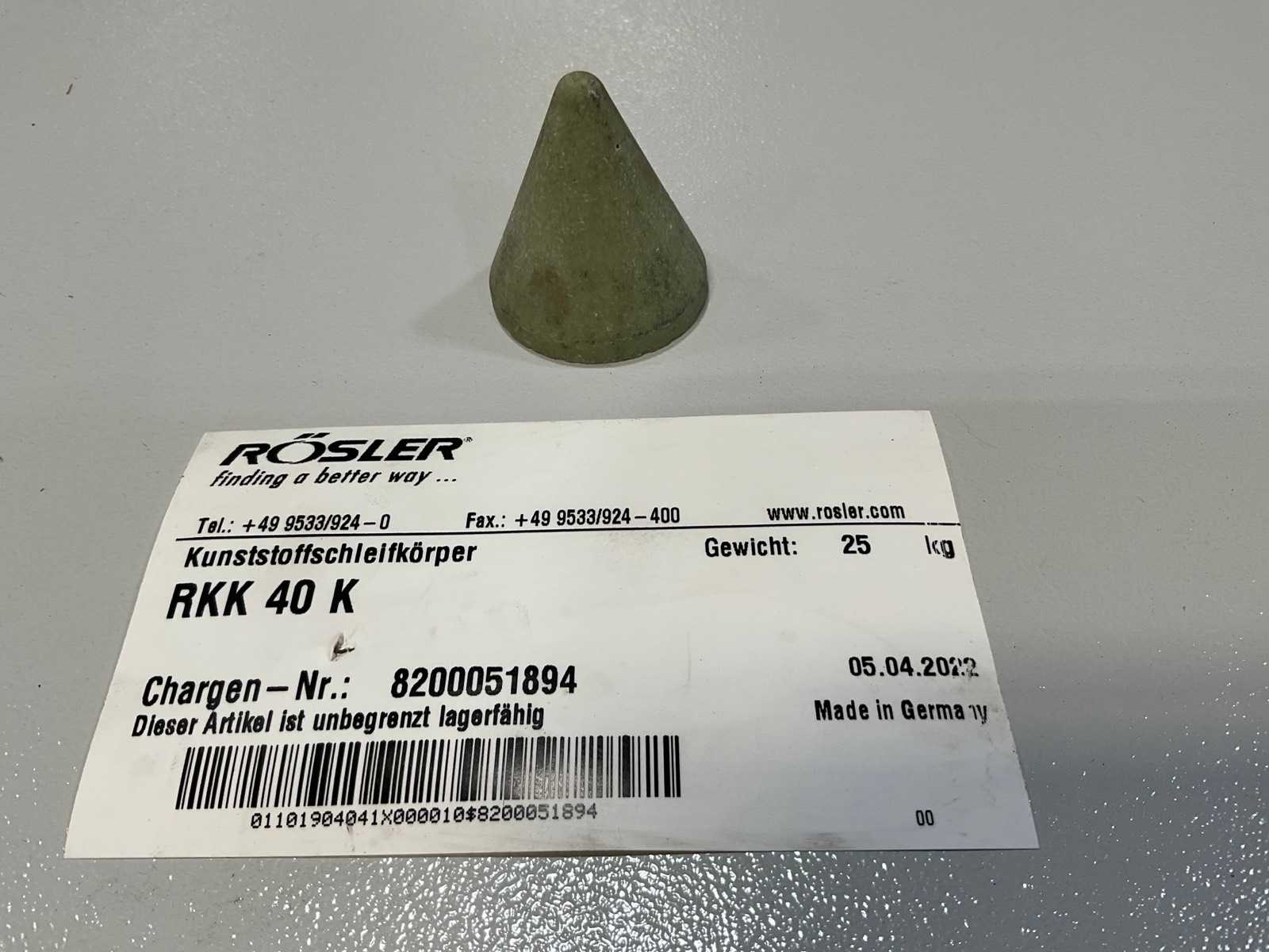 Abrasive bodies, ceramic abrasive bodies, polishing bodies for rotary vibrators, vibratory finishing systems, vibratory finishing rotary vibrators, trowal systems, continuous vibrators -Manufacturer: Rösler, ceramic grinding wheel type RS 40/40 2 bags -Content: 25 kg/bag -Price/delivery: complete -Transport dimension.: 400/380/H400 mm -Total weight: 50 kg