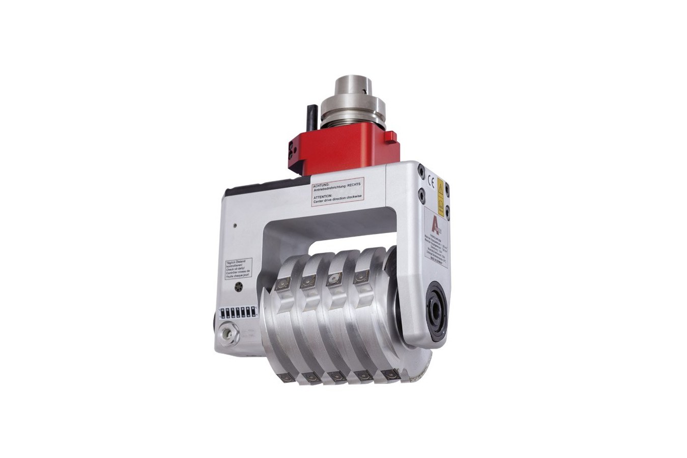 CNC unit for moulding or saw blade package Brand: Atemag Type: Ultra Line Mega Cutter Position of tool spindle 90° Max. drive speed 12,000 R.P.M. Max. tool spindle speed 7.690 R.P.M. Gear ratio i = 1:0,641 Turning direction left/right Torque max. 22 Nm Tool interfaces: arbour with 30mm diameter, 120 clamping length, max. tool diameter 160mm - without tools -