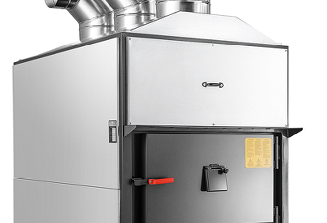 flue capacity: 175 kW; Conventional yeld capacity: 140 kW; flue diameter: 200 mm; hot air delivery pipes: 3 x 250 mm; flue length: 950 mm; oven width: 600 mm; oven hight: 860 mm; air flow: 6300 m³/h; power consumption: 8900 W; aproximate surface to heat up: 2200 m³; area to be heated: 500/600 m²; heater height without hot air conveying pipes: 2200 mm; heater width: 930 mm; heater length: 1700 mm; weight: 615 kg; Horizontal oven made of thermal chrome plated stainless steel, reinforced with ribs. Exchangers 2 or 3 smoke revs. Inner side made of bright sheet metal for casing and insulation. Outer side made of zinc plated sheet metal. Frame made of painted profile. Feeding doors with refractory and extractable grates. Panels with refractory for pipes cleaning. Double suction centrifugal fans for hot air delivery running at low regime of turns and arranged on special ela ...