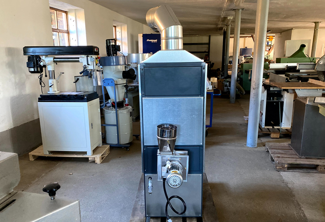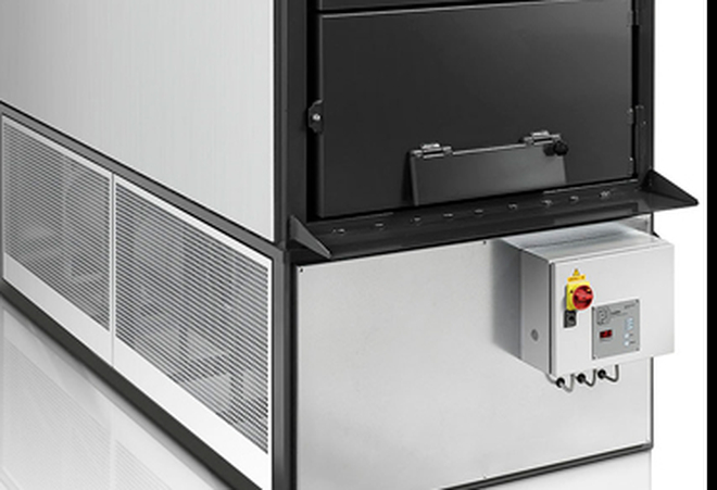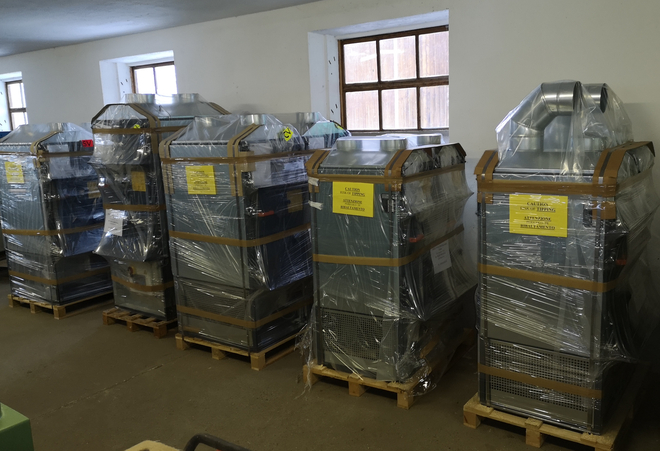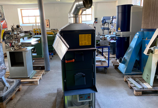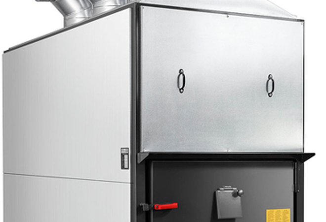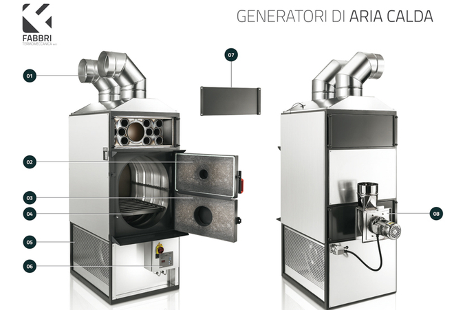 flue capacity: 510 kW; Conventional yeld capacity: 407 kW; flue diameter: 250 mm; hot air delivery pipes: 4 x 350 mm; flue length: 1900 mm; oven width: 900 mm; oven hight: 900 mm; air flow: 26000 m³/h; power consumption: 4500 W; aproximate surface to heat up: 8000 m³; area to be heated: 1800 m²; heater height without hot air conveying pipes: 3000 mm; heater width: 1220 mm; heater length: 2700 mm; weight: 1575 kg; Horizontal oven made of thermal chrome plated stainless steel, reinforced with ribs. Exchangers 2 or 3 smoke revs. Inner side made of bright sheet metal for casing and insulation. Outer side made of zinc plated sheet metal. Frame made of painted profile. Feeding doors with refractory and extractable grates. Panels with refractory for pipes cleaning. Double suction centrifugal fans for hot air delivery running at low regime of turns and arranged on special el ...