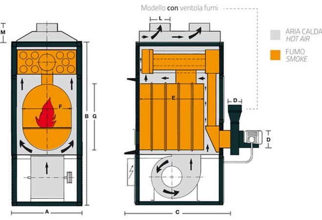 flue capacity: 34 kW; Conventional yeld capacity: 29 kW; flue diameter: 160 mm; hot air delivery pipes: 2 x 180 mm; flue length: 500 mm; oven width: 400 mm; oven hight: 590 mm; air flow: 2200 m³/h; power consumption: 400 W; aproximate surface to heat up: 500 m³; area to be heated: 100/150 m²; heater height without hot air conveying pipes: 1560 mm; heater width : 550 mm; heater lenght: 920 mm; weight: 190 kg; Horizontal oven made of thermal chrome plated stainless steel, reinforced with ribs. Exchangers 2 or 3 smoke revs. Inner side made of bright sheet metal for casing and insulation. Outer side made of zinc plated sheet metal. Frame made of painted profile. Feeding doors with refractory and extractable grates. Panels with refractory for pipes cleaning. Double suction centrifugal fans for hot air delivery running at low regime of turns and arranged on special elastic ...