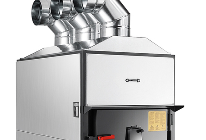 flue capacity: 350 kW; Conventional yeld capacity: 279 kW; flue diameter: 200 mm; hot air delivery pipes: 3 x 300 mm; flue length: 1200 mm; oven width: 740 mm; oven hight: 1040 mm; air flow: 17800 m³/h; power consumption hot air fan: 3 kW; power consumption flue gas exhaust: 600 W; aproximate surface to heat up: 5000 m³; area to be heated: 1000 m²; heater height without hot air conveying pipes: 2500 mm; heater width: 1100 mm; heater length: 1900 mm; weight: 850 kg; Horizontal oven made of thermal chrome plated stainless steel, reinforced with ribs. Exchangers 2 or 3 smoke revs. Inner side made of bright sheet metal for casing and insulation. Outer side made of zinc plated sheet metal. Frame made of painted profile. Feeding doors with refractory and extractable grates. Panels with refractory for pipes cleaning. Double suction centrifugal fans for hot air delivery run ...