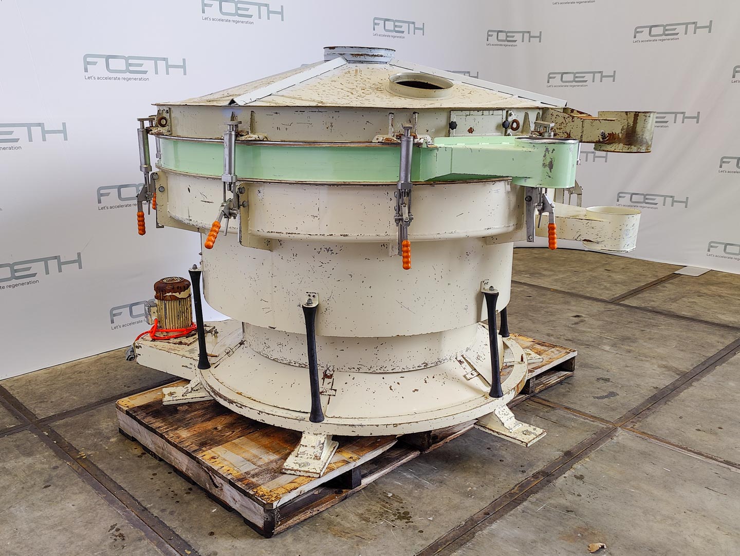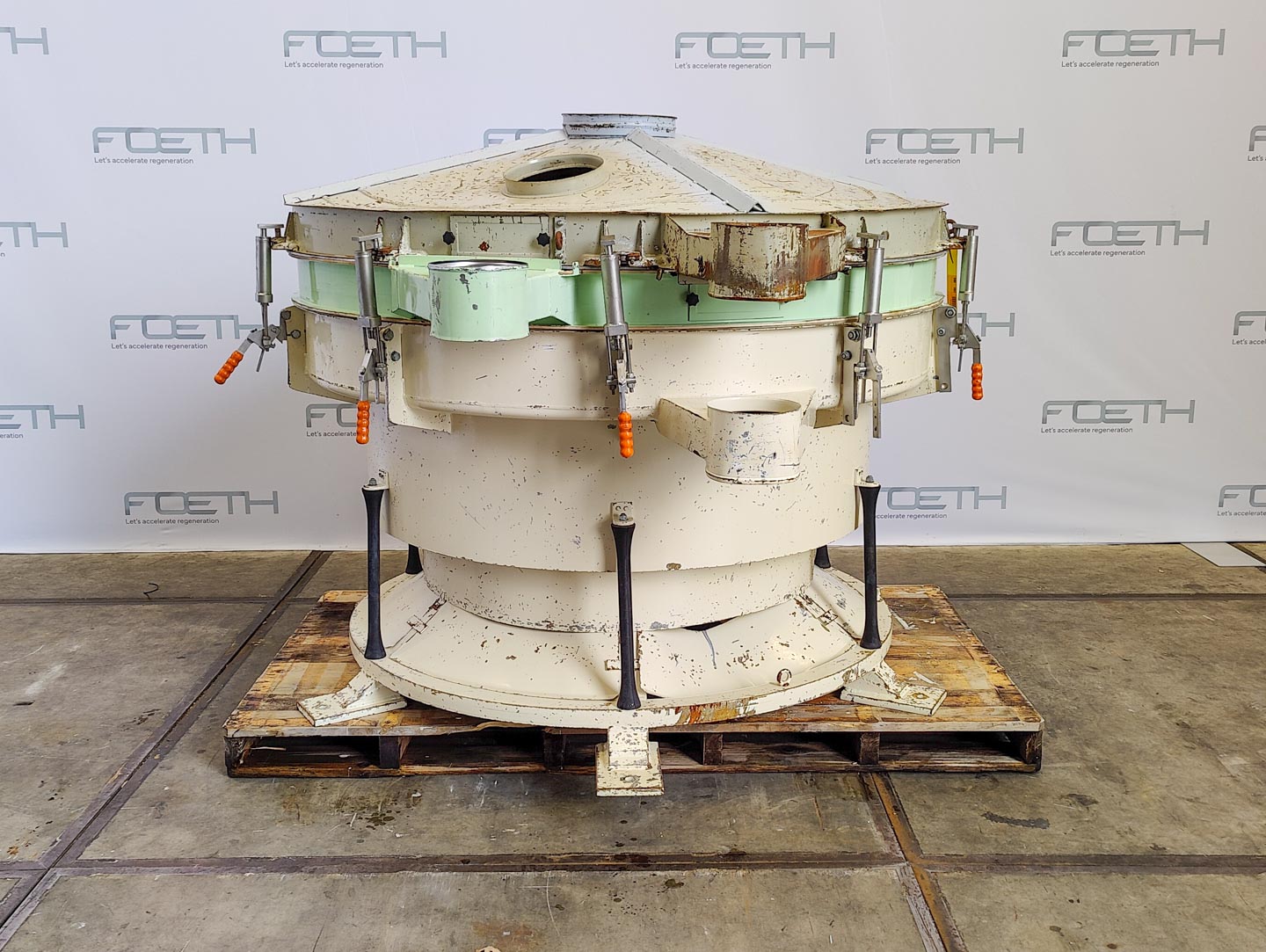 General SKU426X1426 LocationBarneveld CEcheck MakeAllgaier Main Features MaterialStainless steel Surface2.3 m2 Sizes diameter1720 mm Specified Features - Tumbler screener Vibro sievecheck Sieve surface2,3 m² Number of sieve decks:3 Sieve sizesø 1720 mm With covercheck Inletø 300 mm Outletø 200 mm Drive vibro motorcheck Motor3,0 kW, 400/690 V, 1415 rpm, (Ex) Sieve perforation10 mm, 5 mm, 3 mm With ball cleaningcheck With extra sieve decks8 mm, 3 mm, 1 mm Tumbler screening machines MaterialStainless steel 1.4305 (303), Stainless steel 1.4571 (316Ti) Information Serial5795 TypeTSI 172 Year of construction2004 Year of construction2004 Mounted on mild steel framecheck With switchcheck Floor space2,10 x 2,00 m Total height1,80 mTumbler screening machinesAllgaierSieves > Tumbler screening machinesBrand > Allgaier What you can expect from Foeth: -- Machine is ...