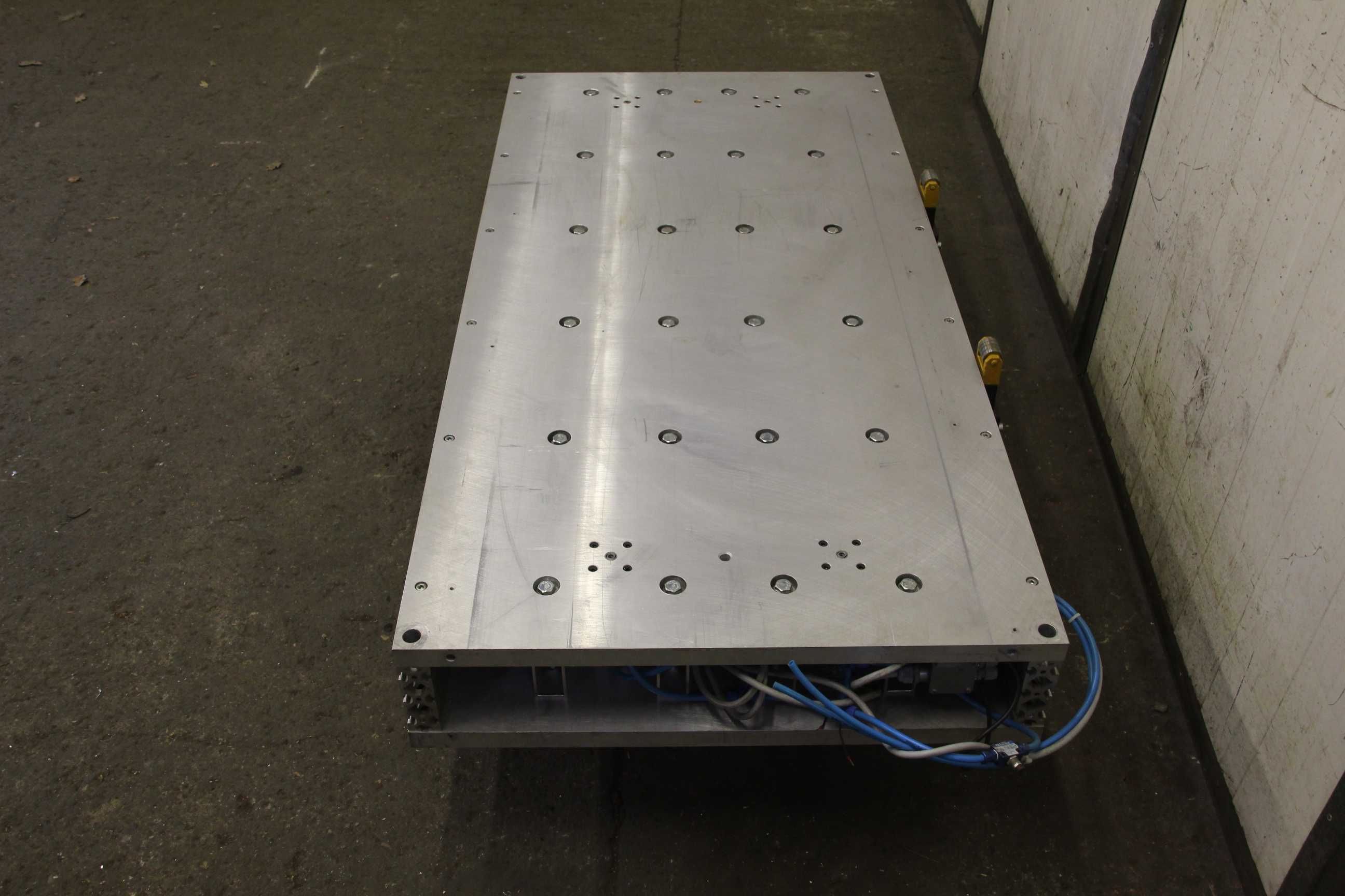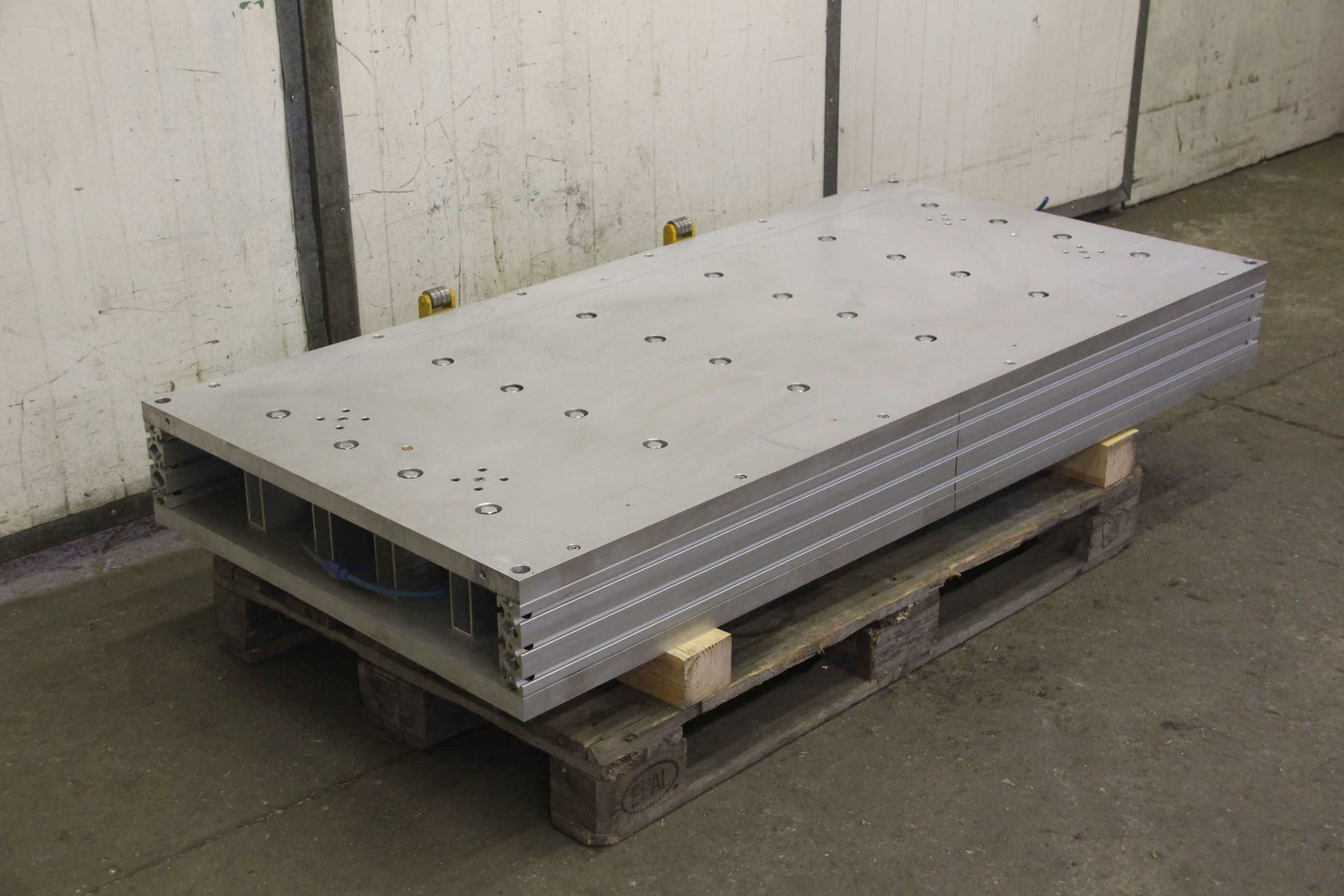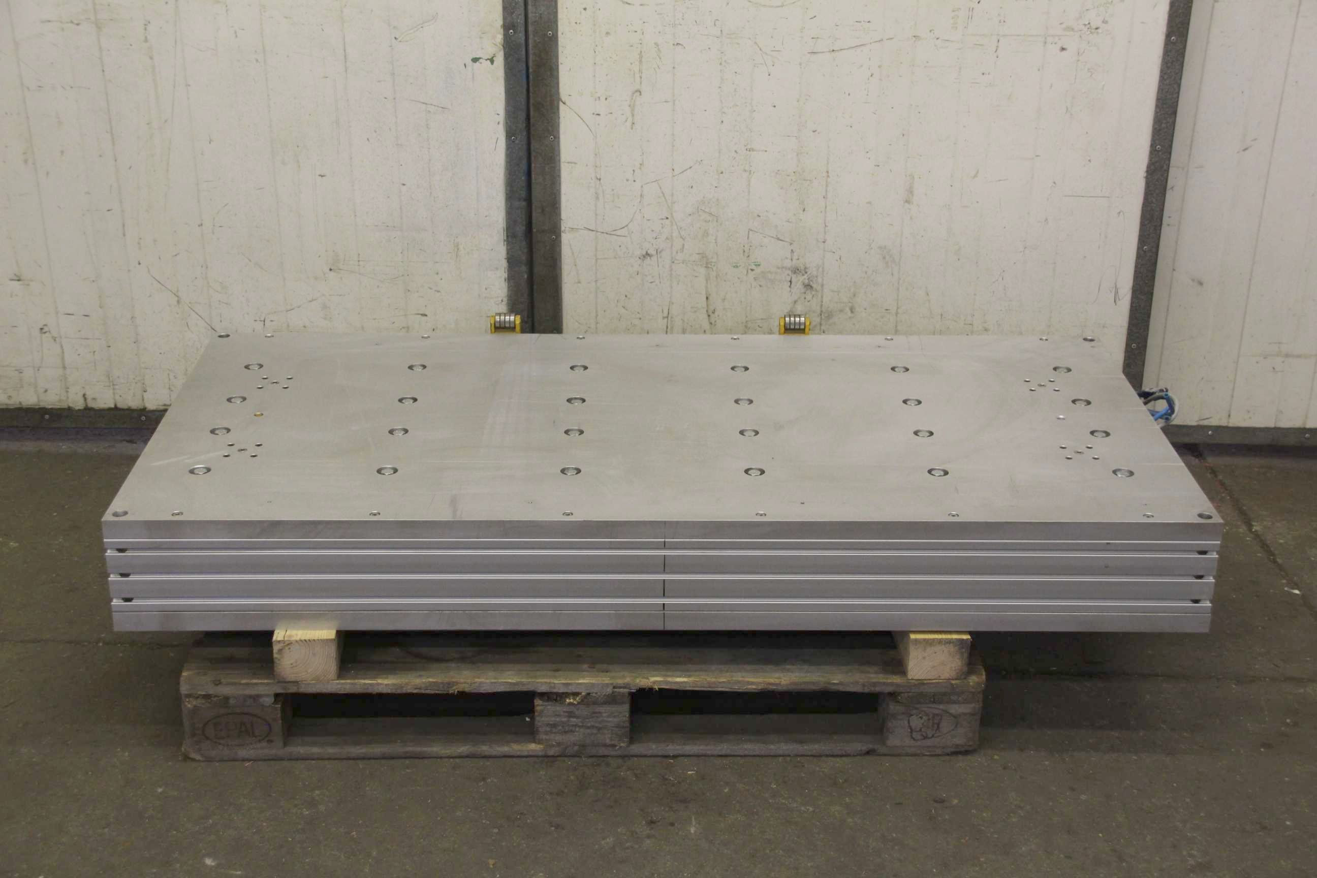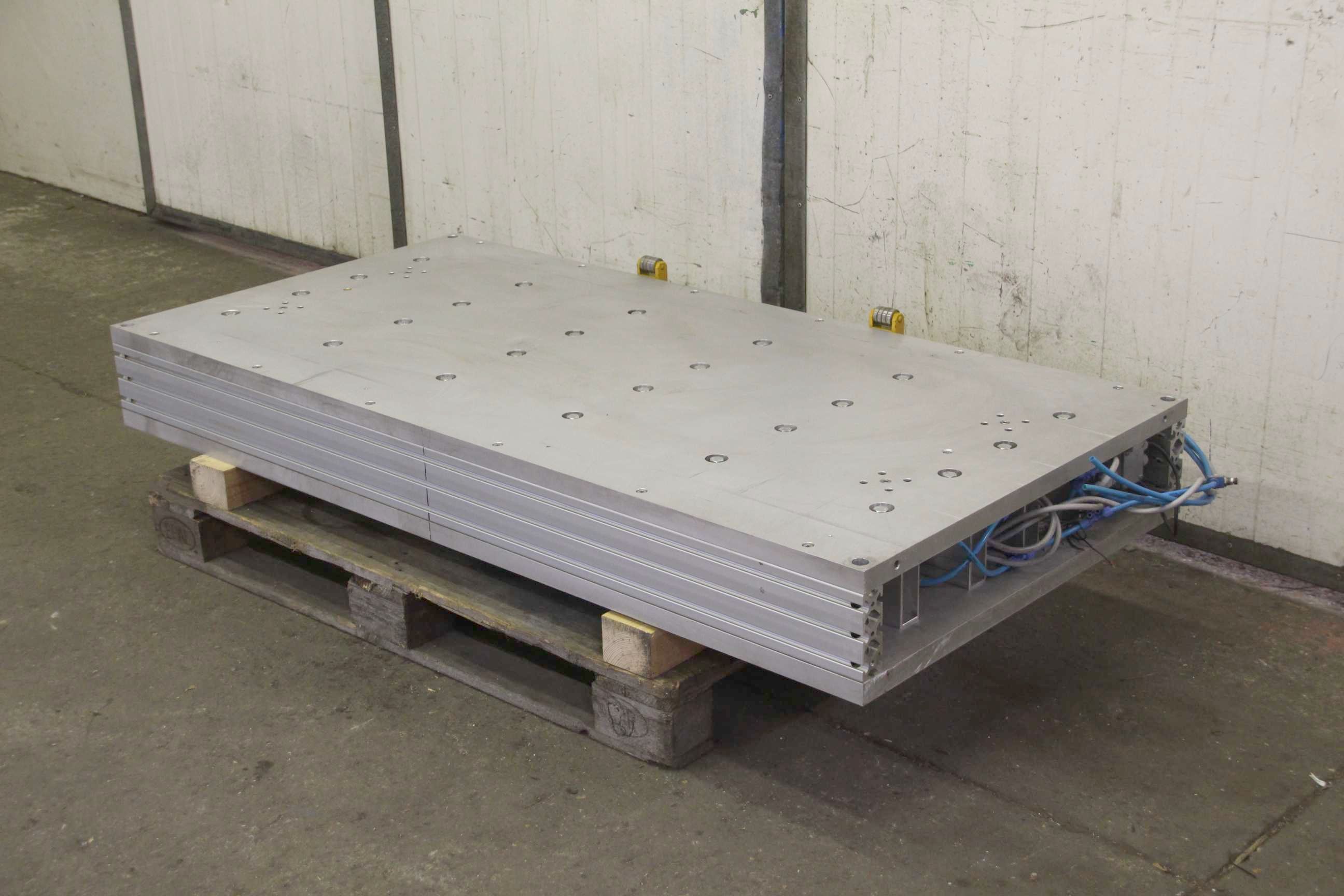 Clamping plate with pneumatic cylinder, centering table, centering device, plate field, welding table, welding table, plate boring machine -Clamping plate with: 24 pneumatic cylinders -Material: aluminum -Width: 775 mm -Table length: 1600 mm -Height: 180 mm -Dimensions: 1600/775/H180 mm -Weight: 250 kg