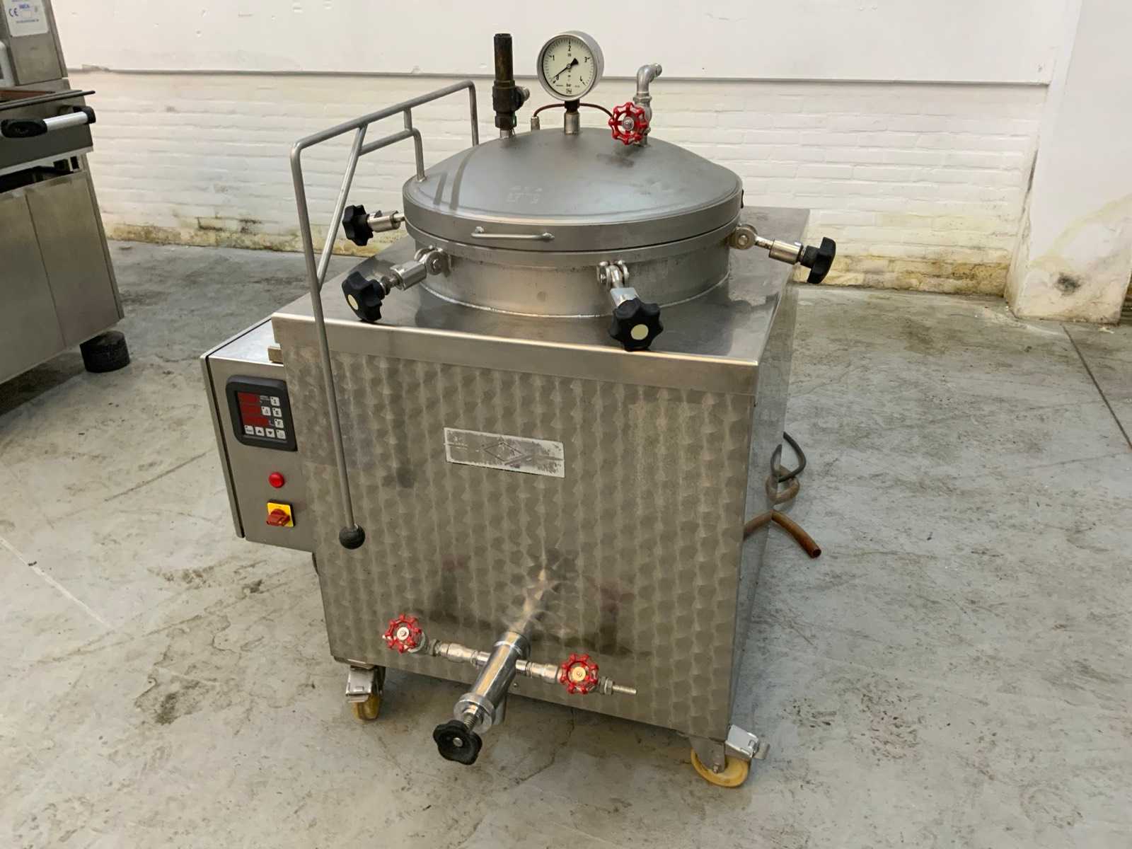 Korimat KA 160 autoclave, 120 liters, 2.5 bar, mc control, as an autoclave for sterilizing including the measuring of the core temperature, as a rapid pressurized boiler for cooking meat, vegetables, soaps, and ready-to-serve meals, electrically heated, smooth surface. You are very welcome to test the machine in our facility in Koblenz, Germany.