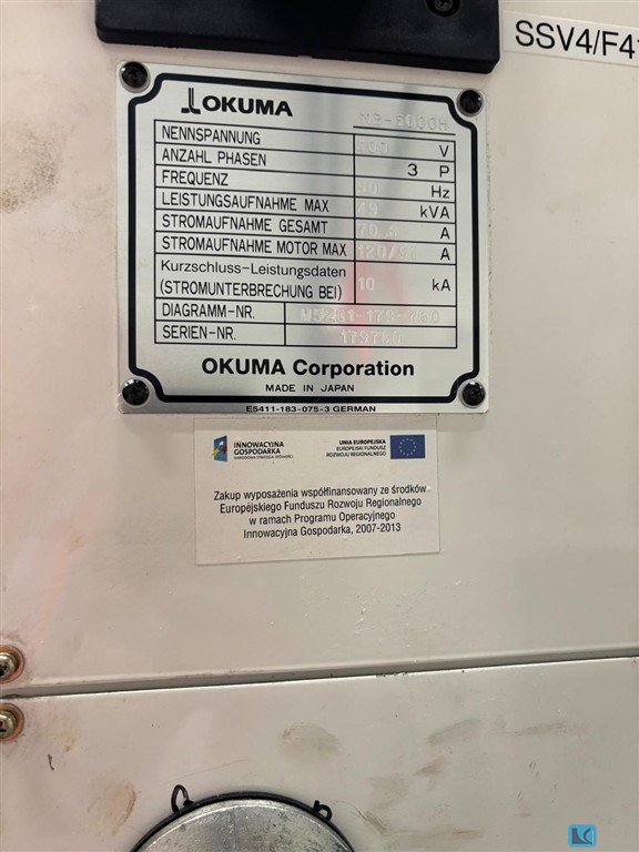 x-travel: 710 mm y-travel: 510 mm z-travel: 510 mm Control: Mazatrol M 32 size of pallet: 500x500 mm spindle taper ISO: 40 turning speeds: 50-10000 U/min Spindle capacity: 7,35 KW tool magazin:: 60 Cooling through the spindle: bar numbers of pallets: 6 total power requirement: kW weight of the machine ca.: 8,5 t dimensions of the machine ca.: m The data for this ad was created with ModulMWS - the software solution of LogoTech oHG.