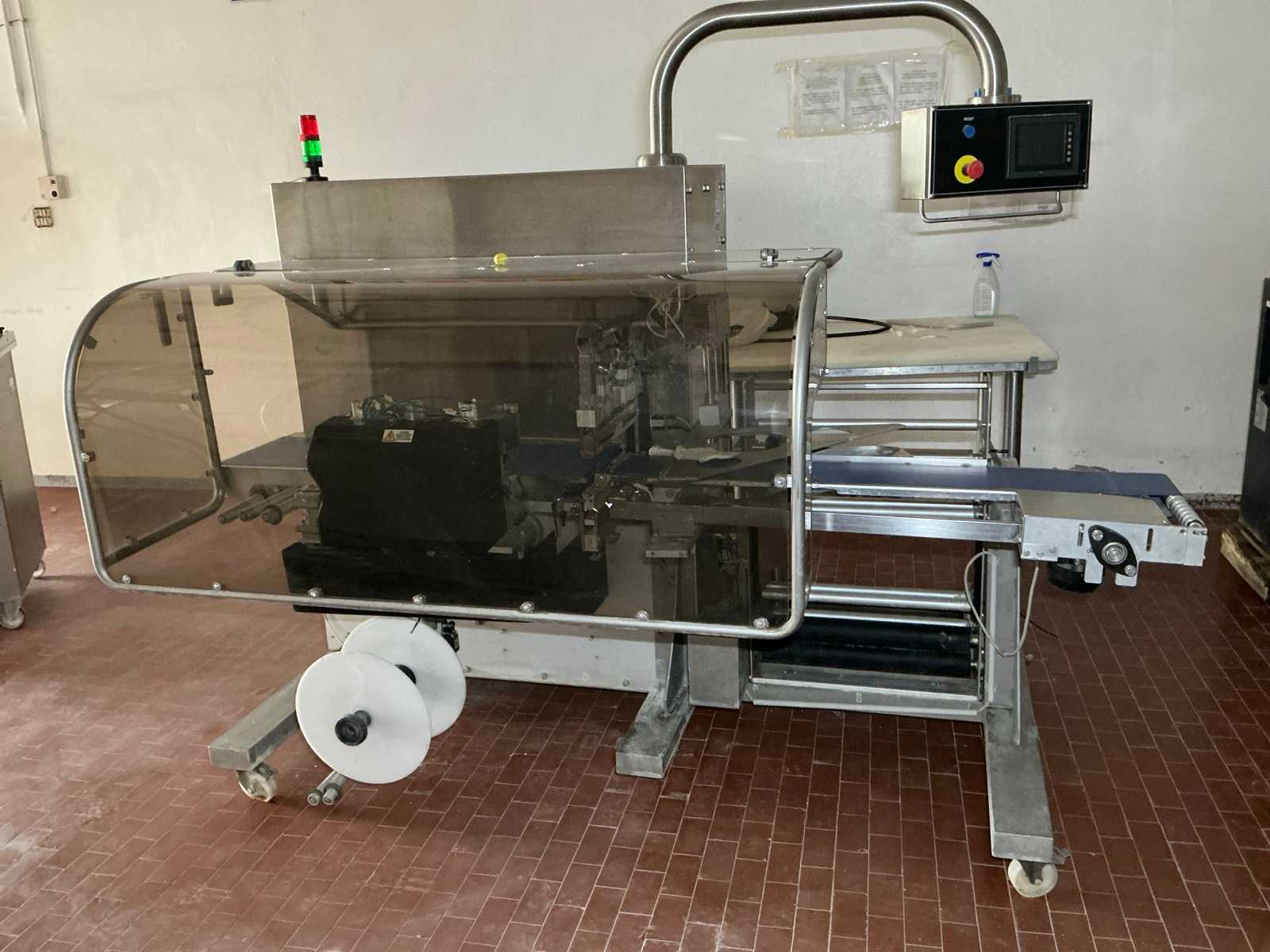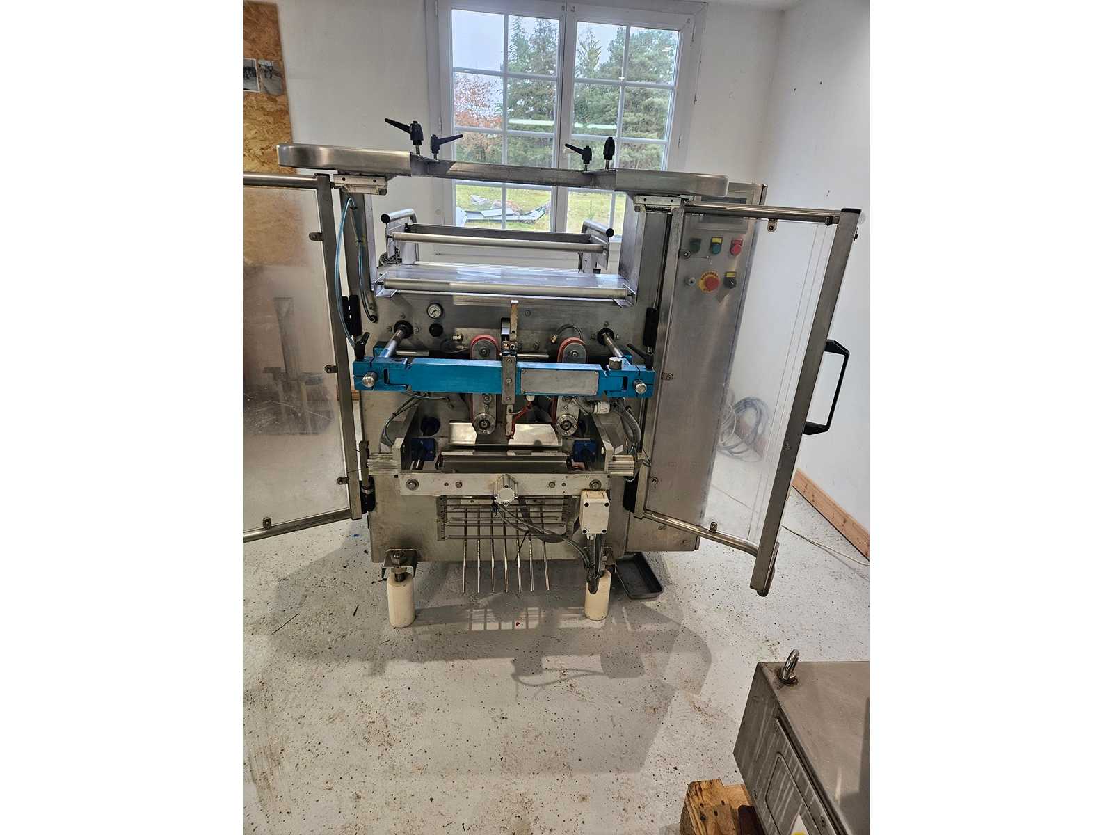 Good working condition. Dates from 2004. With 5-unit preloader. PLC: Omron Sysmac CJ1G CPU43H HMI: Omron NS5-TQ10-V2 Wetted Parts: 304 Stainless Steel Max Throughput: 60 products/minute Product Length: 60 to 630 mm CE Compliant Power Supply: 400 V / 50 Hz Installed Power: 3.5 kW Supply Pressure: 6 bar Overall Dimensions (LxWxH): 2850 x 800 x 1800 mm Throughput 60 /min Bag Height 90 mm Bag width 630 mm Type Automatic Auction-ID: A1-44626-98