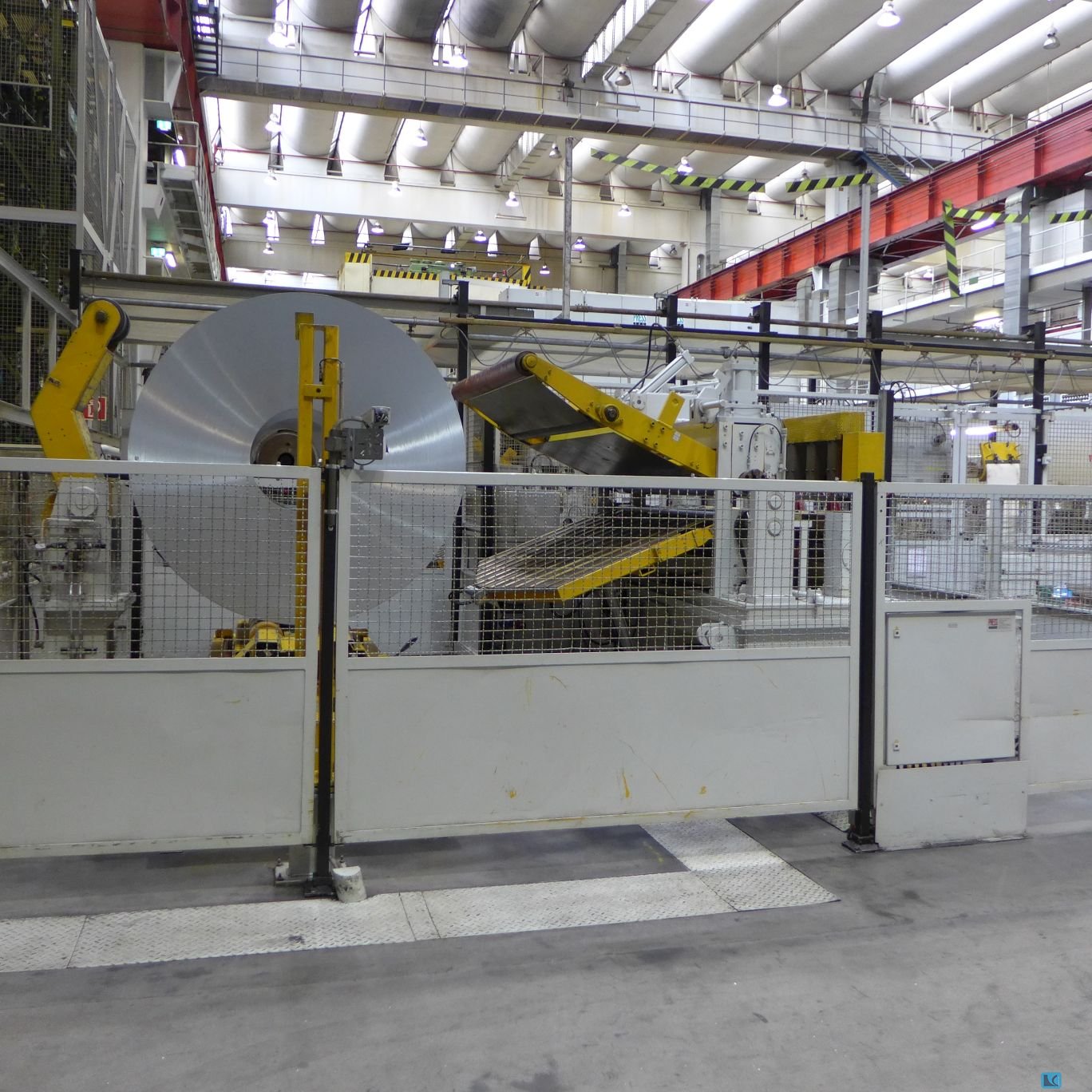 band width:1050 mm plate thickness:8 mm number of rolls:8 DECOILER:. - design : single coil :. - sheet width max:1050 mm - sheet width (min):150 mm - max. weight of coil:22 to - max. diameter of coil:2000 mm - min. internal diameter of coil:570 mm FEEDERS:. - feeder: type : roll feeder :. - sheet width max:1050 mm - sheet thickness max:150 mm LEVELER UNIT:. - sheet width max:1050 mm - sheet width (min):150 mm - sheet thickness max:8 mm - sheet thickness (min):2.5 mm - number of leveler rolls:8 - diameter of leveler rolls:96 mm - distance between leveler rolls:104 mm - diameter of feed rolls:160 mm - feed velocity min.:2 m/min - feed velocity max.:43.5 m/min ELECTRICAL SPECIFICATIONS:. - mains voltage:400 V - mains frequency:50 Hz Technical description : Sheet metal unrolling and straightening system for thick sheet metal up to 8 mm, consisting of: - LAWECO COIL LOA ...