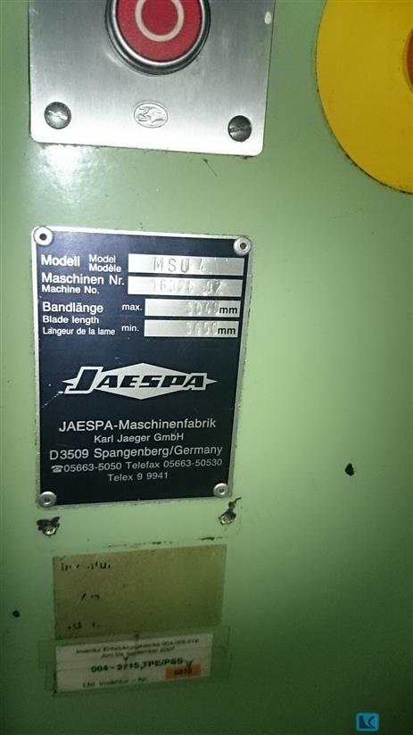 Metal band saw, band saw machine, band saw, vertical band saw -Manufacturer: Mössner Rekord, vertical band saw type SM/400 with saw band welding device -Cutting width: max. 390 mm -Cutting height: max.215 mm -Engine power: 1.1 KW -Saw band: length 2780 to 2980 mm -Saw blade speed: adjustable -Work table: swiveling -Band saw welding machine: Ideal BSO -Dimensions: 1050/630/H1670 mm -Weight: 414 kg