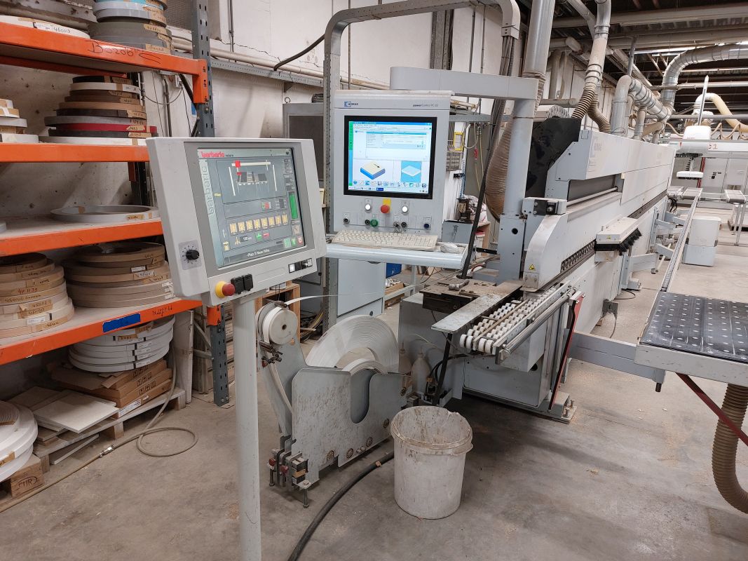 Joining unit with 2 joining motors of 1.5 kw each 12000 rpm Roll stock scissors of 0.8-2 mm Glue tray with glue roller for 3 kg Spare tray for 3 kg (colour change) 3 rollers of printing unit Feed speed 13 m/min Preheating lamp Rounding milling at the top and bottom Corner copy rear front Edge Scraper Spray agent before buffing Buffing unit - Rolls 0.4-2 mm - Panel thickness 15-50 mm - Min. plate 70 x 200 mm - Plc control touch screen - Roller bearings up to D 550 mm - Operating pressure 6 bar - Ce version - Machine dimensions 390 x 70 x 150 cm