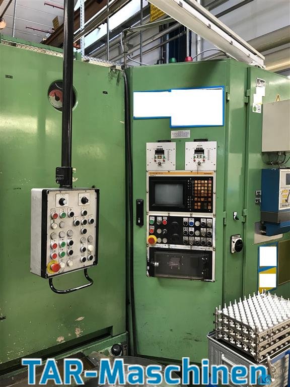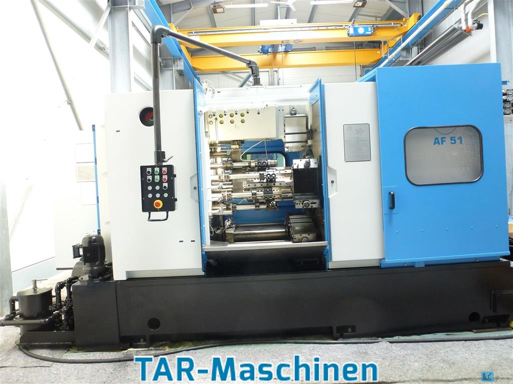 number of spindles:8 spindle passage:51 mm Article: multi spindle automatic lathe Manufacturer: Schütte Type: AF51 Yob: 1987 eight main spindles max. bar diameter D=51mm control SIEMENS SIMATIC S5 pick up in pos. 7, for rear machining thread cutting drive independent feed in positions 2/3 electronical trip dog control ?Balluff? clear text display Wöhrle coolant pump magnetic cartridge filter oil running incl. bar loader IEMCA PRA 40/37/F, yob 1987, (bundle type) Painting in light blue and light grey The configuration of tooling will be different like pictures. Please, contact us for getting more information and pictures on mail(at)tar-mc.com or www.tar-mc.com