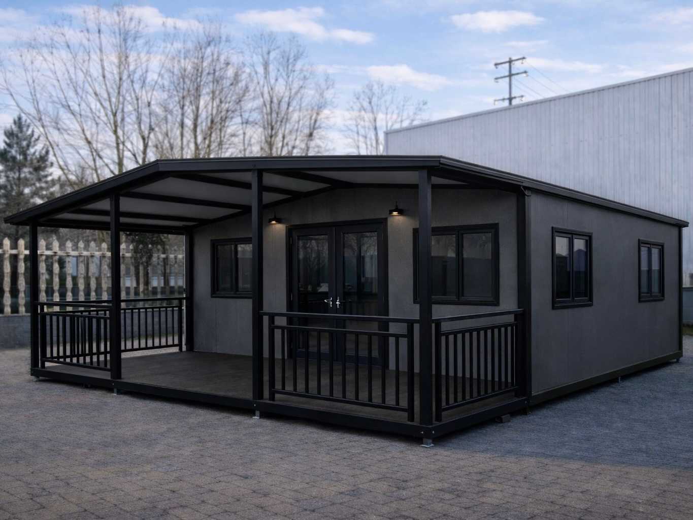 Equipped with pointed roof with balcony/canopy 2 meters long; insulated walls and roof; 2 bedrooms; living room with corner kitchen; bathroom with shower, toilet and sink; each room equipped with lighting and sockets 230V; meter cupboard; PVC floor; aluminum windows and doors; lockable; water, electricity and drainage can be easily connected is prepared; unused and ready for transport (note furniture not included) (transport dimensions 590x220x248 cm, weight 3100 kg) Auction-ID: A1-40103-12
