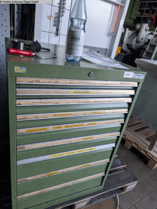 Specifications: - 1 tool holder frame inclined - 1 tool holder frame extendable - 1 pull-out drawers W 900 x D 500 x H 70 mm - 1 pull-out drawers W 900 x D 500 x H 140 mm - Space requirement W 1000 x D 500 x H 1950 mm - 26 SK 40 tool holders, some with clamped tools - 30 pcs plastic inserts - Various milling machines Accessories - Cabinet is not lockable - Weight of cabinet approx. 120 kg - Weight of tools approx. 80 kg