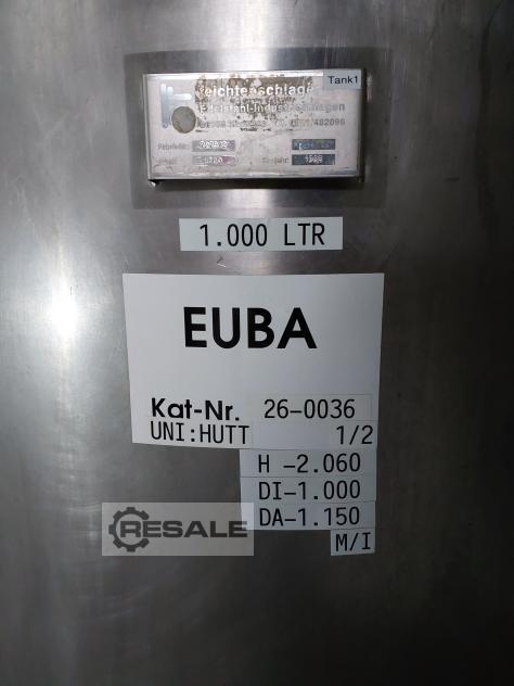 Eurolux Beer Tanks / Fermentation Tanks in AISI 304 test pressure: 1,5 bar, operating pressure: 0,99 bar with Cooling Jacket with Isolation - Capacity: 1000 Litres NEW Material: V2A (AISI 304) 1.4301 Upper bottom: with Manhole with 6 Screws incl. thread connection DN 50 according to DIN 11851 with over- and underpressure valve Tank Body: with Cooling Jacket 600 mm wide with inlet 1” external thread with Isolation Lower bottom: With Conical Bottom and rest outlet underneath with a forklift and pallet truck Measurements and weight: WxH: 1150 x 1950 mm Zyl. height: 850 mm weight: 170 kg Surcharges/unit (price upon request): Fermentation Connector DN 50 Fermentation Lock Butterfly valve DN 40, DN 50 Sample Valve CIP Cleaning System Blind Cap DN 50 Immersion socket for temperature control Temperatur ...