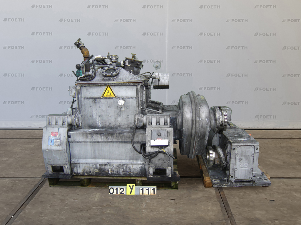 General SKU082Z322 MakeWerner & Pfleiderer, Stuttgart TypeUK-14 X/AU No.154 576 Year of constructionunknown LocationBarneveld Pressure Working pressure6 Bar Main Features MaterialMild steel Volume200 Ltr. Motor17.5 KW Specified Features - Z-blade mixer Jacketcheck Max. temperature220 Degr. C. Screw speed20/40 Rpm Arm speed27/20 Rpm (front/back) Capacity250 Ltr, Useful 200 Ltr Double shaft kneaderMixtruder (1x) Masticator-armscheck Trough sizes740x685mm With covercheck With screw dischargecheck Motor30,0 KW, 380 Volt Motor11,0/17,5 KW, 380 Volt Z-blade mixers MaterialMild steel Information With switchgear(Dim. 80x40x180 CM) Floorspacekneader 2,8x1,4 M Total height1,6 M Weight3200 KG Extra Specifications- Dimensions drive unit 1,4x1,0x1,7 M (LxWxH), weight 2130 KG Technical specs Extra informationtest pressure is achieved at 220 Degr. C.Z-blade mixersDis ...