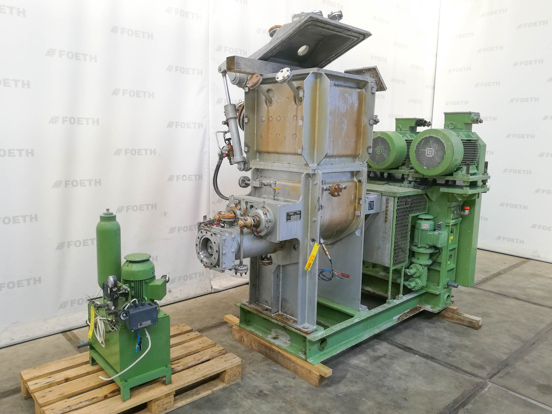 General SKU054F306 MakeWerner & Pfleiderer Stuttgart TypeUK-80 K4UH No.163 258 / 483 188 Year of construction1979 LocationBarneveld Pressure Working pressure2 Bar Vacuum possiblecheck Working pressure jacket10 Bar Main Features MaterialStainless steel Volume80 Ltr. Specified Features - Z-blade mixer Z-blade mixer(1x) Capacity170 Ltr, Useful capacity 80 Ltr Trough sizes515x525x600mm With covercheck With jacketcheck Max. temperature350 Degr. C. Double geared(hydraulic driven, power pack is missing) With adjustable packing glandscheck Hydraulic tiltingcheck With hydraulic unitcheck Motor2,0 KW, 220/380 Volt MaterialStainless steel 1.4571 (316Ti) Information Mounted on foundationcheck Floorspace2,8x1,2 M Total height1,9 M Weight2450 KG Extra Specifications- With additional set masticator arms Z-blade mixersCatalysts & fillersFeed additivesPaper & otherDiscoun ...