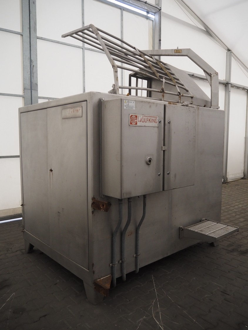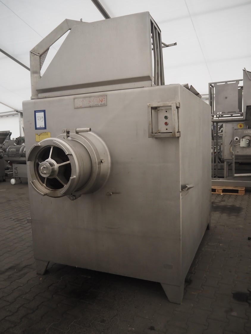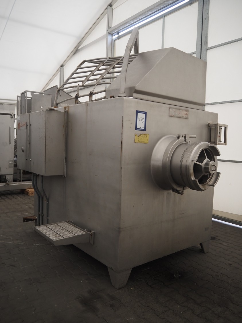 Wolfking frozen block grinder, type: Y/D-REV, serial number: 52753, 380 V, 3 Ph, 50 Hz, 250 A, 33 kW, plate diameter: 400 mm, total dimensions: 2700 mm x 1900 mm x 2800 mm. Including pallet with parts.