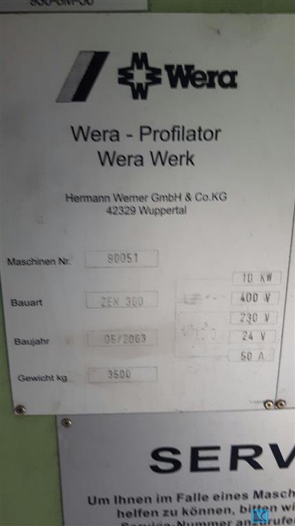 max. wheel diameter:300 mm gear width:100 mm max. module:5 workpiece turning speeds:0 - 1000 1/min work piece - max.:1100 mm workpiece clamping:auto. tension device number of spindle speeds:1000 1/min. spindle bearing diameter:100 mm diameter of spindle flange:120 mm tailstock travel:80 mm weight of the machine ca.:3500 KG dimensions:1200 x 1450 x 2250 mm total power requirement:10 kVA The Gear Tooth Deburring machine WERA, ZEM 300 for deburring of splines gear wheels and shafts, with Pointing Facility.