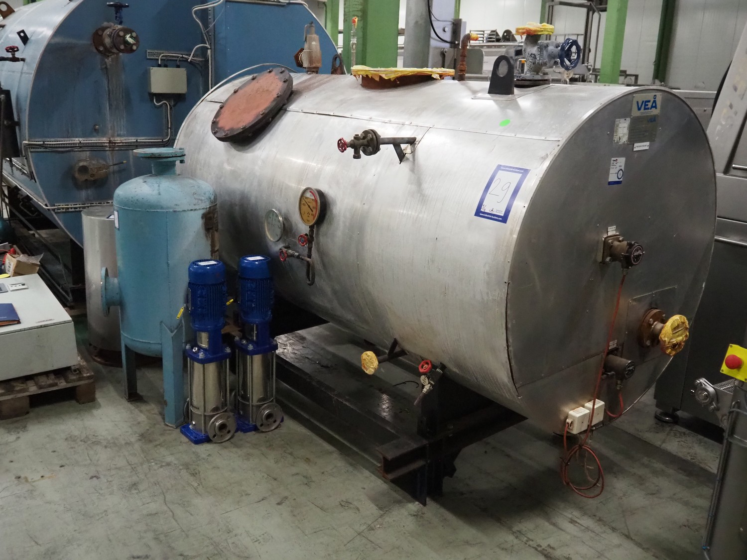 Boiler installation consisting of: - VEÃ… AB steam boiler, type: Ã…NGPANNA VEÃ… UNIVEX 32 H-13, manufacturing number: 880025, year of construction: 1988, steam generation: 3000 kg/h, nominal output: 1965 kW, steam evaporation: 1.111 kg/s, design pressure: 13 bar, design temperature: 195 °C, with Weishaupt GmbH burner, type: WM-G10/3-A, number: 5867560, year of construction: 2009, maximum: 1000 kW, gas type: N, total dimensions: 4800 mm x 2500 mm x 3400 mm. - VEÃ… AB storage tank with switch cabinet and pallet with parts, type: MATARVATTENTANK 2.5 m³ MFD AVGASARE, year of construction: 1988, design temperature: 150 °C, design temperature: 4 bar, dimensions: 2800 mm x 1500 mm x 2000 mm, - Switch cabinet, dimensions switch cabinet: 600 mm x 300 mm x 1100 mm, - Pallet box with parts, dimensions: 1200 mm x 800 mm x 400 mm. - VEÃ… AB boiler tank, type: UTBLÃ…SNINGSKÄR ...