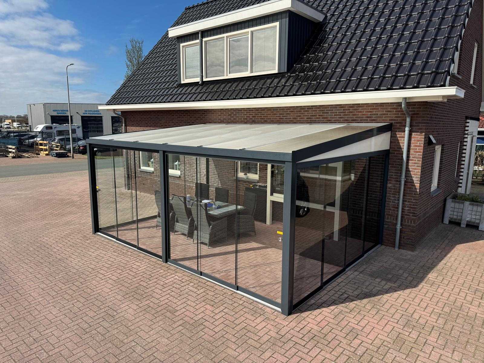 Aluminum canopy with a width of 600 cm and a depth of 250 cm. The construction is made of high-quality aluminum in the color anthracite (RAL 7016), which provides a modern and low-maintenance finish. The roof is equipped with 16 mm thick polycarbonate sheets in opal (milky white) version. These panels are sun-resistant and provide pleasant light without direct bright sunlight. The canopy is delivered as a kit with all the necessary materials. Please note: The photos used are partly sample photos and give an impression of a mounted canopy. These do not correspond one-to-one with the product offered. The sample photos may show options, such as spot lighting, that are not included with this canopy. In addition, photos have been added of the actual loose materials as delivered. Auction-ID: A1-40103-113