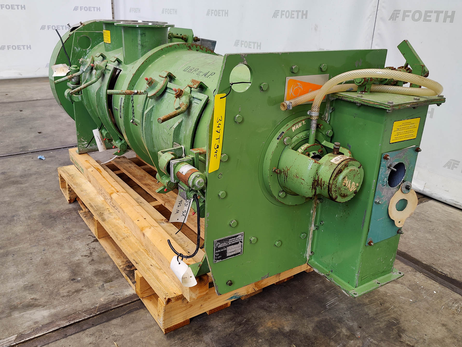 General SKU310T741 MakeWinkworth Typeunknown missing type plate Mounted on framecheck Main Features MaterialStainless steel Volume20 Ltr. Motor3 KW Specified Features - Z-blade mixer Z-blade mixercheck (mixtruder) Capacity20 ltr. Trough sizes355x355x420 mm With covercheck With jacketcheck Double gearedcheck With adjustable packing glandscheck Motor3,0 kW 315 Volt (2x) Arm speed33 rpm Screw dischargecheck (mixtruder) Motor3,0 kW MaterialStainless steel Information LocationBarneveld Floorspace1,3x1,6 m Total height1,6 m Weight1250 kgZ-blade mixersCatalysts & fillersFeed additivesPaper & otherDetergent & surf.Other pharmaceuticsCosmeticsSugarLubricants & oleoAnimal feedOther feedSolid pharmaceuticsDyes & pigmentsMinerals & inorganicPlastic & polymersRubberOther chemicalStarchPowdered foodsPaints & coatingsOils & fatWinkworthKneaders > Z-blade mixersIndustries > Ch ...