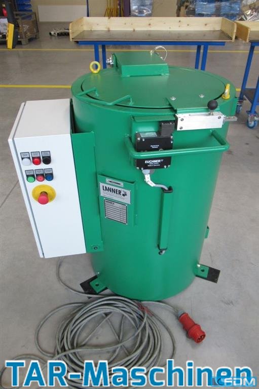 drum diameter:400 mm revolutions per minute:980 U/min total power requirement:2,2 kW Lanner batch wringer ME41-2 for deoiling of metal chips -turnkey delivery and easiest handling -very long service life, operation free of vibrations -compact and easy to maintain, i.e. low maintenance costs and quick return of investment -standard execution consists of lid with pneumatic spring and electro-magnetic lid locking , unbalance detection switch and standstill control -including control cabinet laterally placed, i.e. not in swivel range of crane -drum volume 35 Liter/max. 50 kg -rotation speed max. 980 min-1 -power 2,2 kW Painting: RAL 5012 light blue (batch wringer, crane support) RAL 1003 signal yellow (traverse) RAL 7035 light grey (control cabinet) In each case silk gloss. Changes after consultation. Also included in the scope of delivery: -Crane support with swivel arm: mounted on the side ...