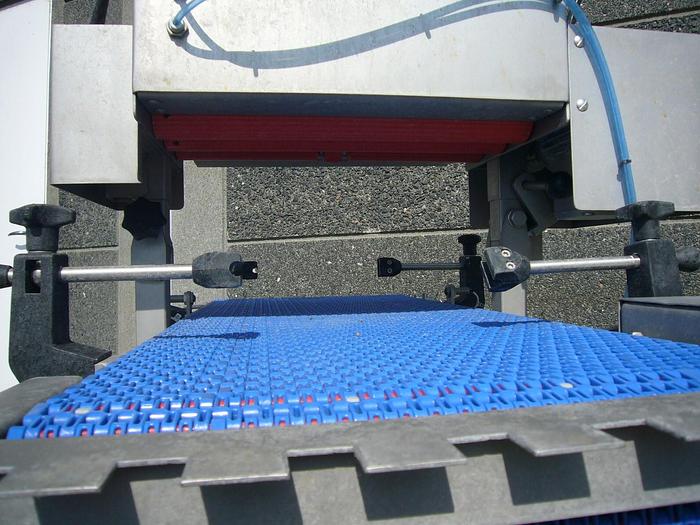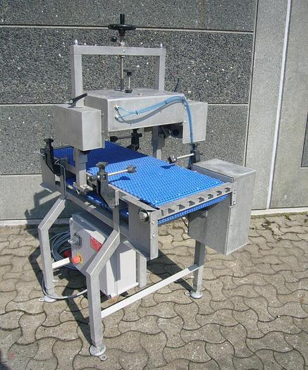 Used K2M 550 cheese block divider with receiving buffer from Kazbi. Details: K2M 550 portion cutting device. Output product: cheese blocks Length: approx. 500 mm Width: approx. 300 mm Height: approx. 100 mm. Final product: Division into 5: 300x100x100 mm Division into 3: 500x100x100 mm Division into 6: 250x100x100 mm Edge bands with leftover trimming. Functional description: Cheese blocks are placed manually on a driven inlet belt and pushed onto a ramp. The ramp is placed in a horizontal position and the block is centered by a system of lateral pressures. The ram is automatically moved and the block is cut into the appropriate number of bars towards the long side. After cutting is finished, the ram is withdrawn and the ramp is raised to accept the next block. The cut bars go to the second cutting section. If we need to cut the block or long ribbons crosswise, the ...