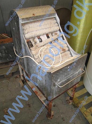 Stock number: D747, Cheese washer machine, stainless steel,, B. Christensen,, standing on legs with wheels., Brush width: 350 mm., 0,37 kW motor, beltdrive., Material: Stainless steel AISI 304