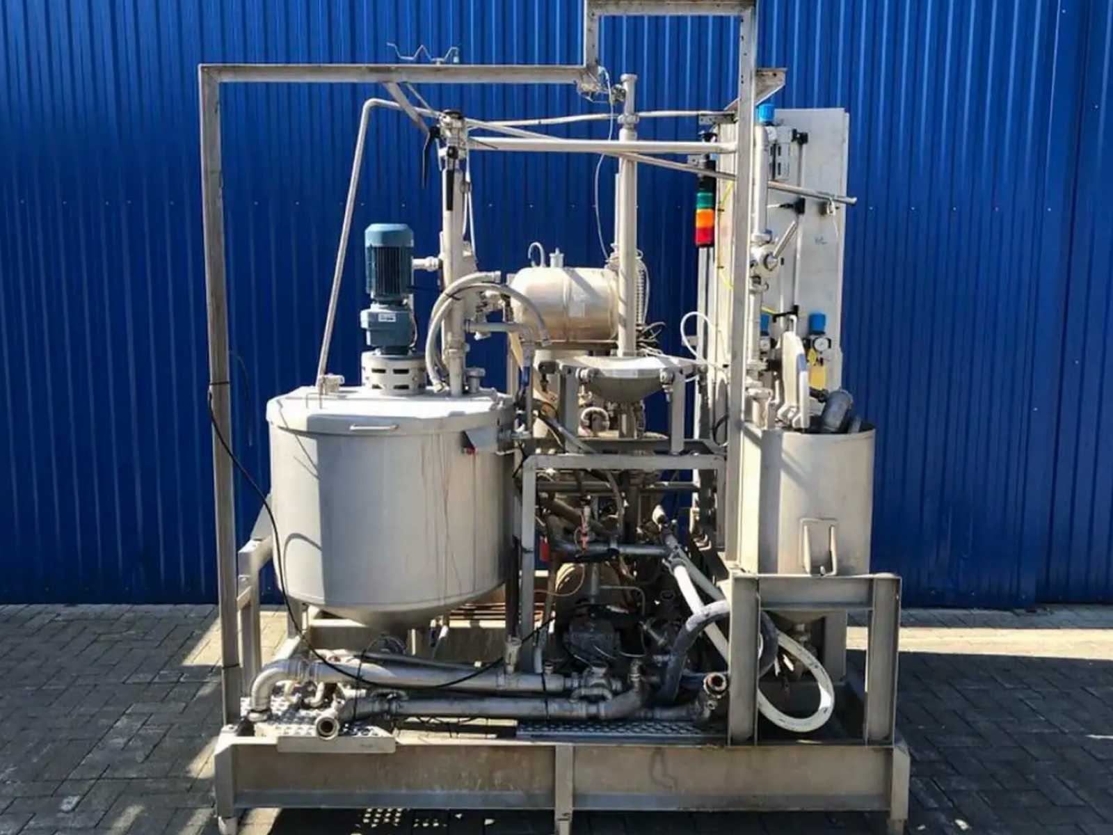Used chocolate tank made by Faspoma, capacity of 3500 L. New 1993. Tank with agitator, heating jacket, has 2.2 kW motor, 705 rpm, CPA 43 pump, control cabinet. Piping within the tanks and platform to the tanks. Very good condition. 3 pieces available.