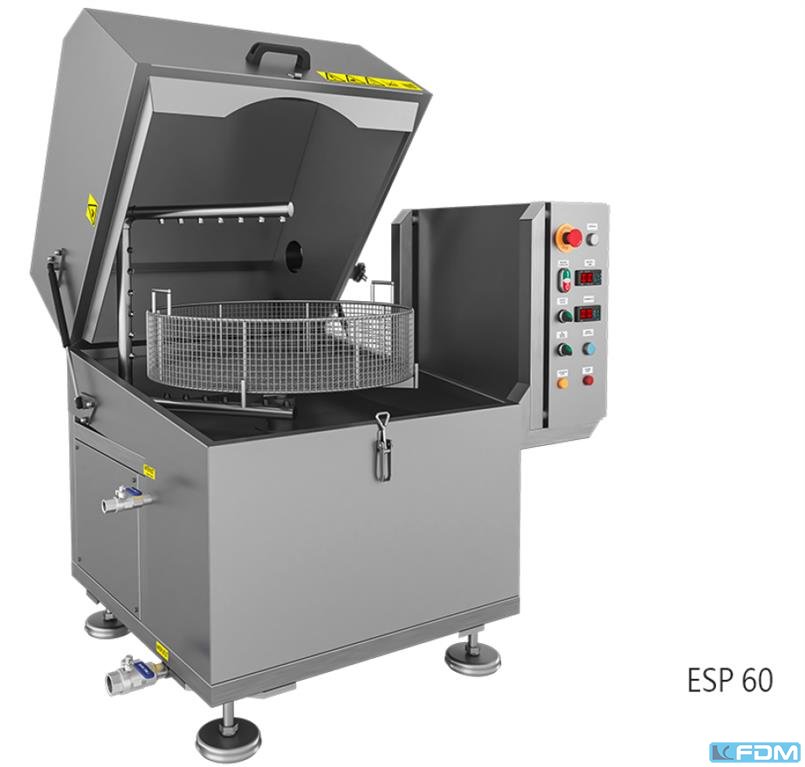 A top-loading batch cleaning system Render is available. Pump capacity: 140l/min, cleaning bath fill volume: 130l, max. operating temperature: 130°C, load capacity: 120kg, connected load: 16kW, machine dimensions X/Y/Z: approx. 1350mm/1200mm/1350mm, weight: approx. 350kg. Includes a transport cart. Documentation available. An on-site inspection is possible.
