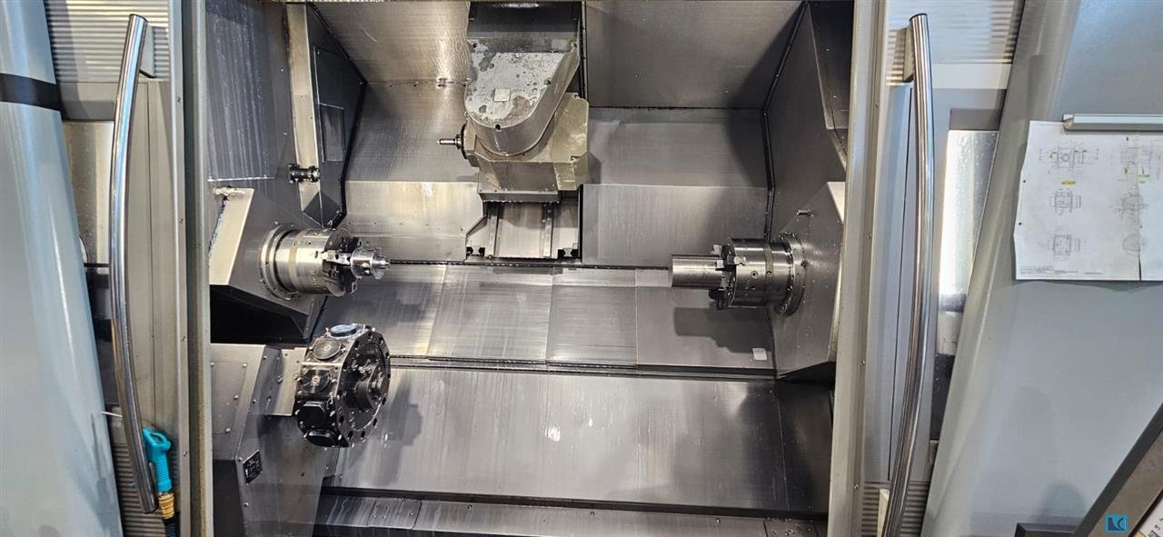 turning diameter:640 / 400 mm turning length:1500 mm control:Siemens 840 D Powerline Travel turret No.1 (milling spindle) x/y/z:550 / 180 (±90) / 1585 mm Swivle angle milling spindle (B-axis):±120° interpol. ° Rapid traverse feeds turret 1 (milling head) x/y/z:40/24/60 m/min RPM milling spindle:12000 1/min power capacity - milling spindle:12 / 23 kW Torque of milling spindle:100 Nm Tool magazine for milling spindle (turret 1):120 HSK-A 63 Tool change time tool/tool, milling spindle:1,6 s Spindle 1 RPM:4000 1/min Spindle 1 power:36/ 45 kW Spindle 1 Torque:730 Nm Spindle 1 max. bar diameter:90 Spindle 2 RPM:4000 1/min Spindle 2 power:36 / 45 kW Spindle 2 torque:730 Nm Spindle 2 max. bar diameter:90 c-axis:0,001 ° Travel turret 2 x:225 mm Travel Turret 2 z:1595 mm RPM of rotary tools turret 2:4000 1/min no. of tools in turret 2:12 VDI 40 high-pressure pump:20 bar total power requiremen ...