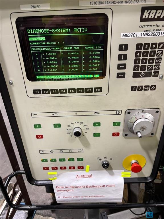 distance spindle /table:min /max 190 / 570 mm distance spindle /table:190 - 570 mm surface area:650 x 300 mm Boring power:in GG 20 40 mm bore capacity in steel:ST 60 32 mm turning speed range::50 - 5000 UpM total power requirement:2,2 kW threading:GG 20 M30 threading::ST 60 M 24 weight of the machine ca.:1400 kg table load:max. 150 kg table height:770 mm traversing speed:max X-, Y- u. W-Achse 5 m/min max. traversing speed:Z-Achse 3 m/min w-axis:380 mm workpiece height max.:495 mm tool changing time:ca. 3 sec x-travel:450 mm y-travel:300 mm z-travel:180 mm workpiece weight:1,5 kg