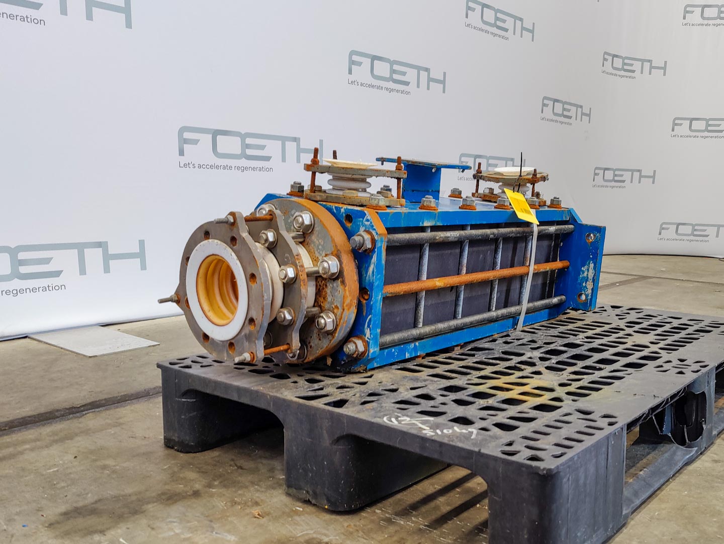 General SKUR0890 MakeLe Carbone AG (F) LocationBarneveld TypePolybloc NF610G Pressure Working pressure shell6 Bar Working pressure tubes6 Bar Main Features Shell (Material)Mild steel Tube (Material)Graphilor Surface16.3 m2 Specified Features - Shell and tube heat exchanger MaterialGraphite Graphilor XBS Heat exchangercheck Verticalcheck Heating surface16.3 m2 Max. temperature165 degr. C Shell capacity80 ltr. Shell diameter660mm Shell length1380mm Max. temperature165 degr. C Shell connectionsDN150 (2x) Cover connectionsDN200 (2x) Capacity94,2 ltr. Information No.130261 Year of construction1990 Floorspace0,9x0,9 M Total height1,8 M Weight1300 KgFine chemicalsStarchOther chemicalRubberShell and tube heat exchangersBiotechnologyAgrochemicalsSpicesPlastic & polymersCatalysts & fillersFeed additivesPaper & otherSolventsDetergent & surf.Other pharmaceuticsCosmetic ...