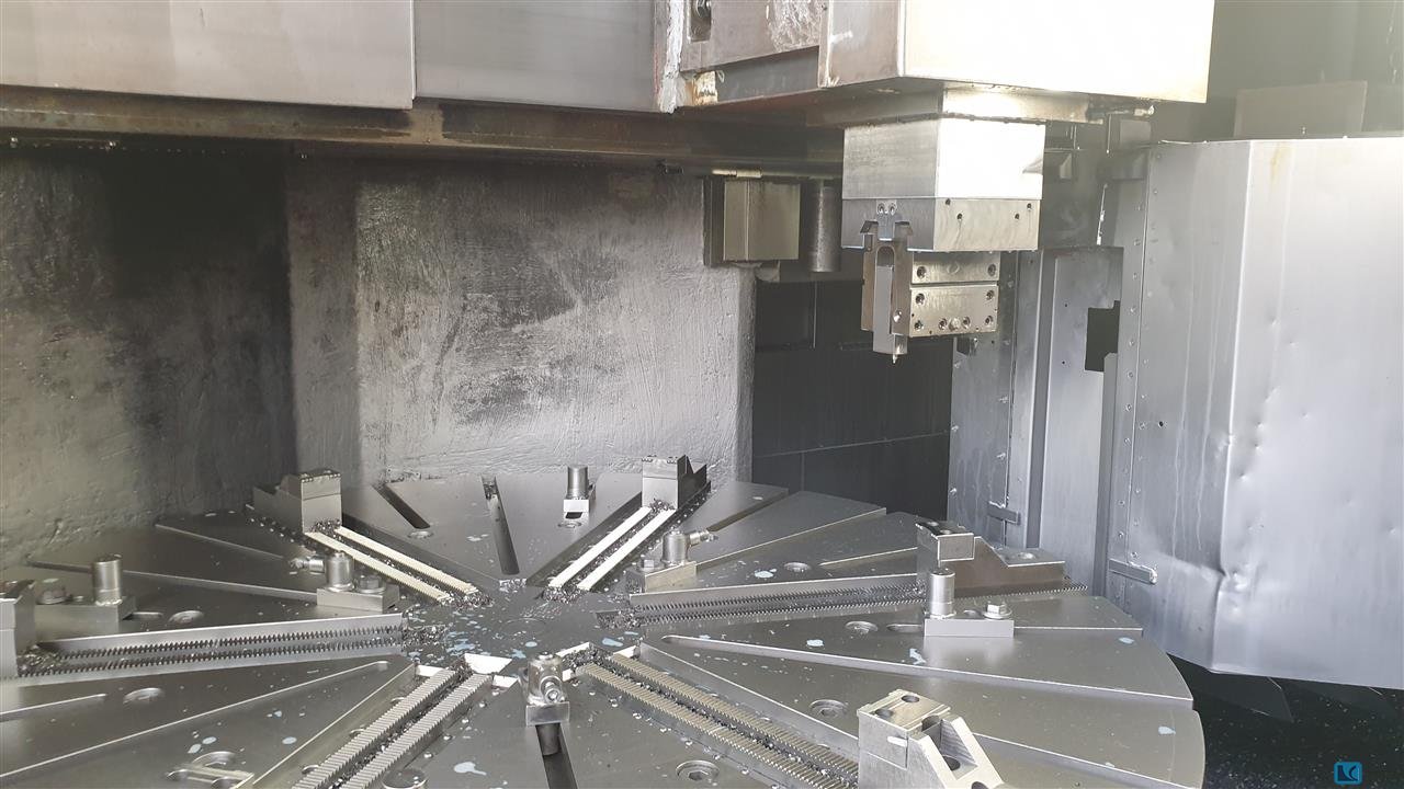Maximale afmetingen van het werkstuk: 800 x 1000 mm tabelindexering elke 0,001° afstand van palletcentrum tot spindelneus: 70 gt; 810 mm afstand van palletoppervlak tot spindelcentrum: 100 gt; 830 mm Hogedrukkoeling via de spindel (70 bar) Uitgerust met Palletech High Rise System = uitbreidbare palletopslag met 2 niveaus voor 12 pallets. spanentransporteur X-axes: 730 mm Y-axes: 730 mm Z-axes: 740 mm Table dimensions: 500 x 500 mm (2x) Max weight on the table: 700 kg Admission in spindle (ISO): BT40 Power on the spindle: 30 kW Toolstore: yes Tools: 160 positions Frequency : 18000 rpm Number of pallets : 12 pallets Length: 9000 mm Depth: 8000 mm Height: 2850 mm Weight: 12,4 ton