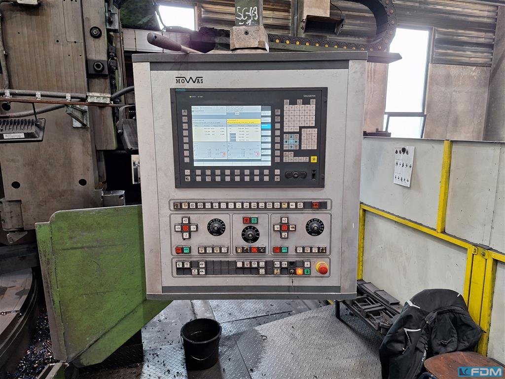 faceplate diameter:4770 mm swing diameter:7000 mm turning height:1000 mm slide stroke:1000 mm workpiece weight max.:100000 kg faceplate turning speed range:2 - 20 U/min feed speeds:1 - 10000 mm/min rapid traverse:10 m/min ram head dimension:250 x 250 mm main drive:100 kW total power requirement:200 kW with CNC SIEMENS 840 D 2 Vertical Supports with toolchanger 12 pockets C-axis and driven tooling SK 50 37 Kw 3000 rpm Chip conveyor and coolant attachment