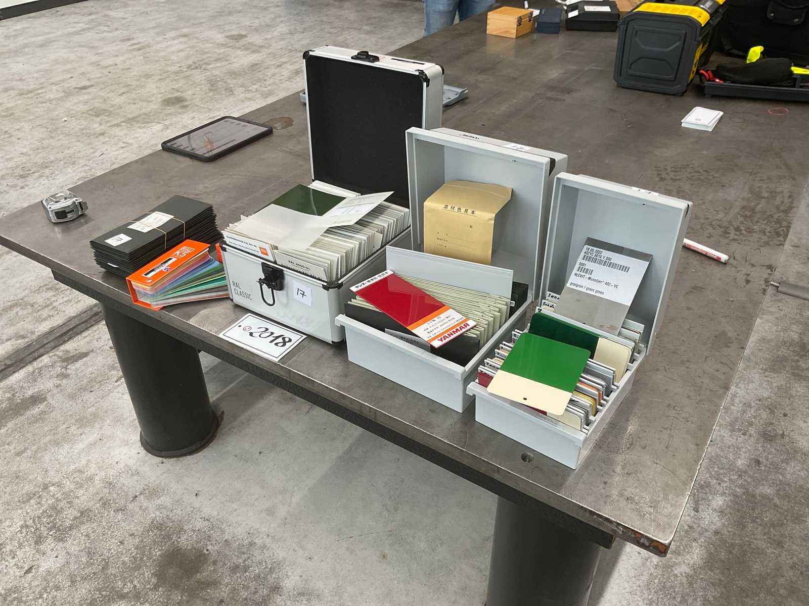 Technical data Manufacturer: e.g. RAL, ALEXIT Model: including RAL K5 Classic Configuration Scope: Several colour fans (including RAL K5 Classic), various colour sample cards, sample plates, sample cases (aluminium), plastic storage boxes. Special features: Extensive color sample collection for industrial coatings and paintings.