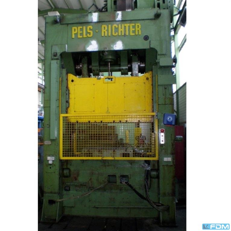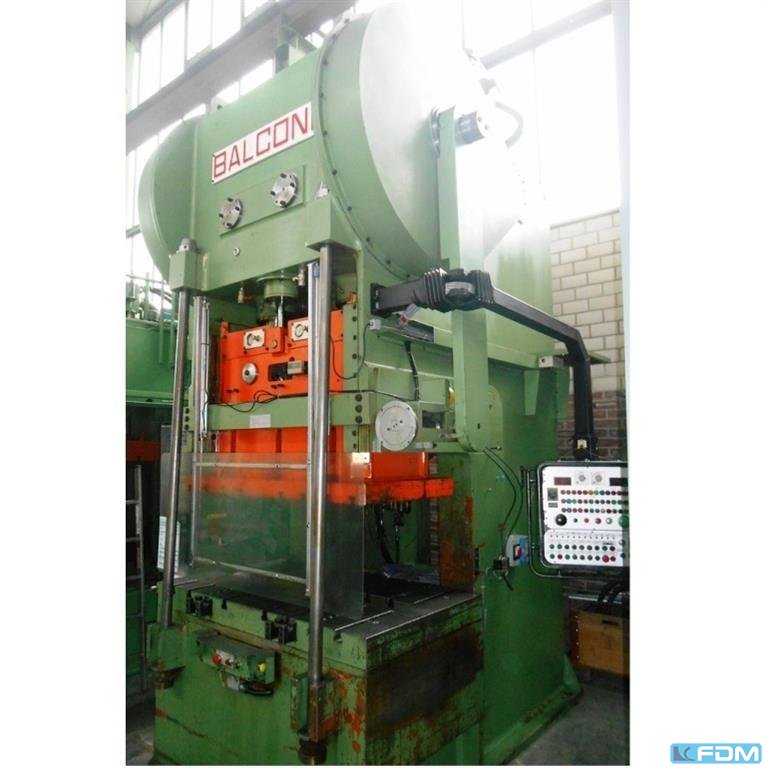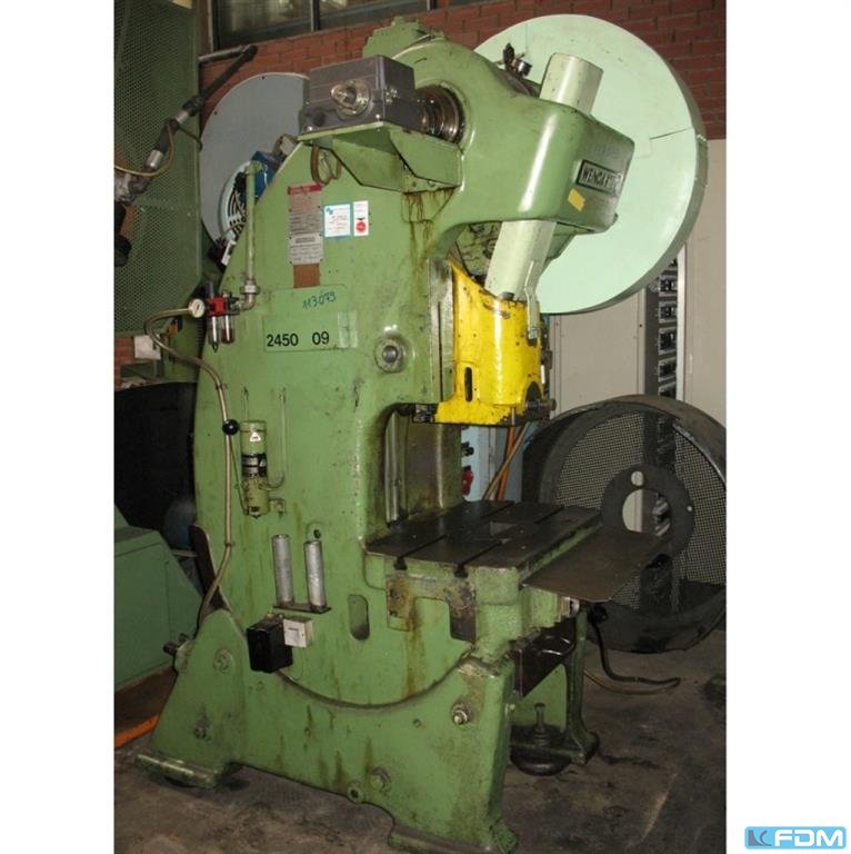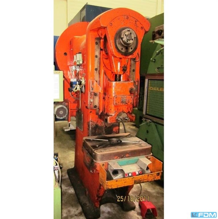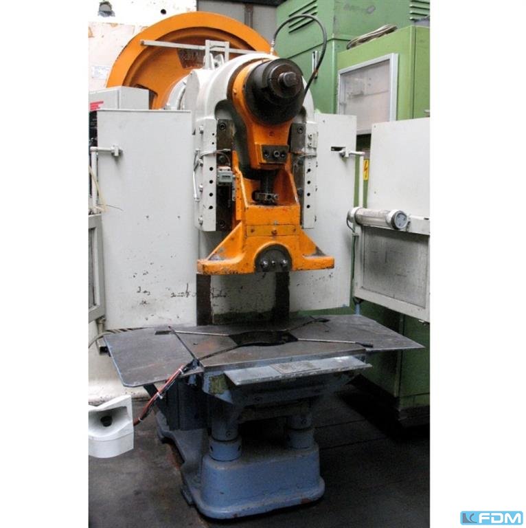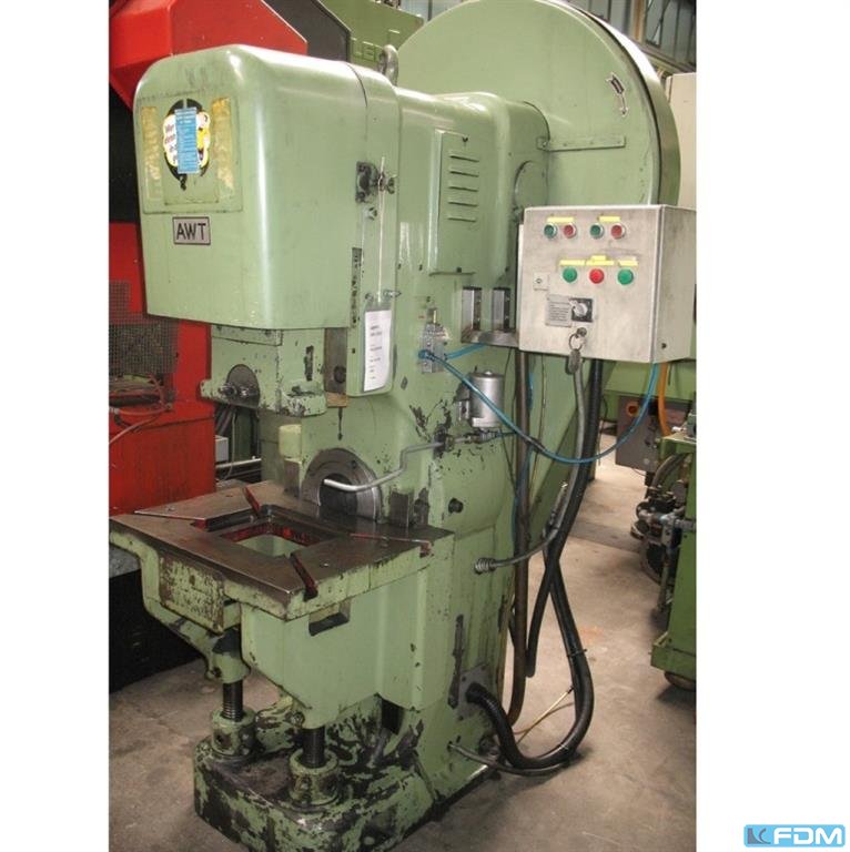pressure:100 t throat:315 mm stroke:30 - 160 mm no. of strokes:40 /min distance table/ram, max. stroke up, adjustment up:460 mm table surface area:910 x 680 mm Hole in the table:400 mm table height over floor:800 mm passage to the back:400 mm ram surface:630 x 400 mm ram adjustment:80 mm power requirement:7,5 kW weight:7,5 t dimensions (WxDxH):1,7 x 2,0 x 3,0 m German Safety: permitted for manual loading:UVV 11.062 - VBG 7n5.1 clutch:pneumatic overload protection in ram:mechanical ram counterbalance:pneumatic